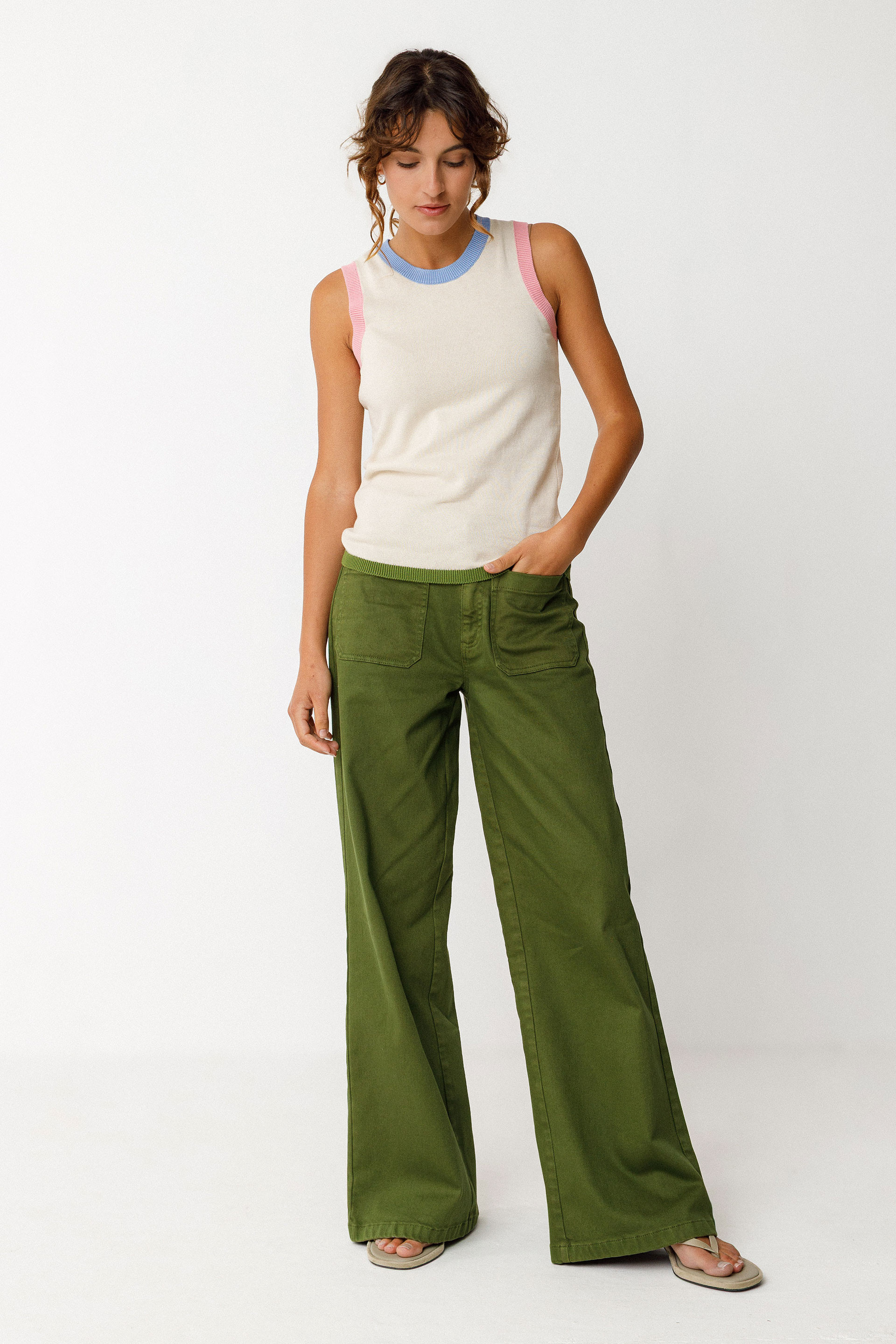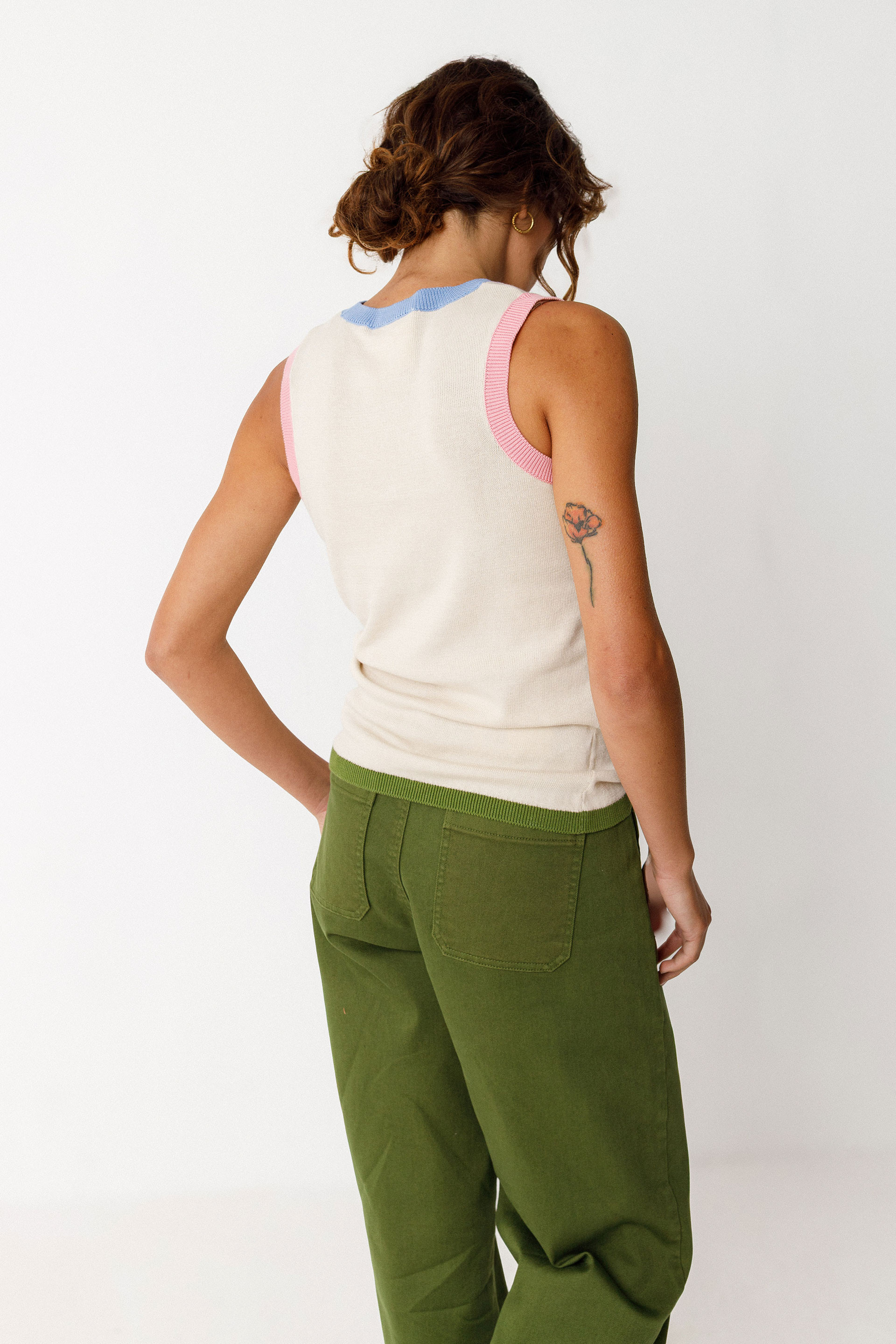 Haut sans manches ajusté en maille légère. Col rond et finition côtelée au col, aux emmanchures et à la taille dans une couleur contrastante.