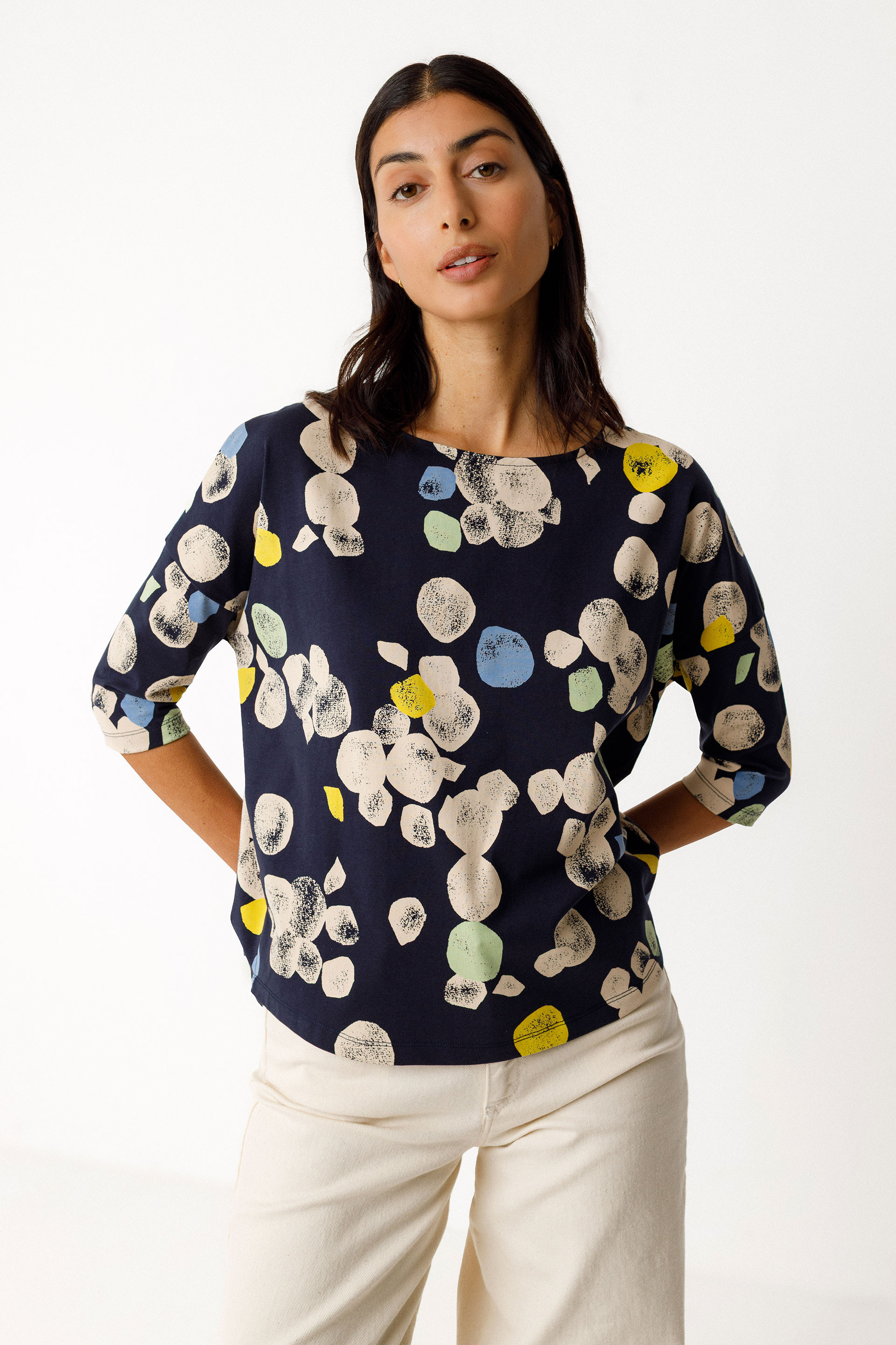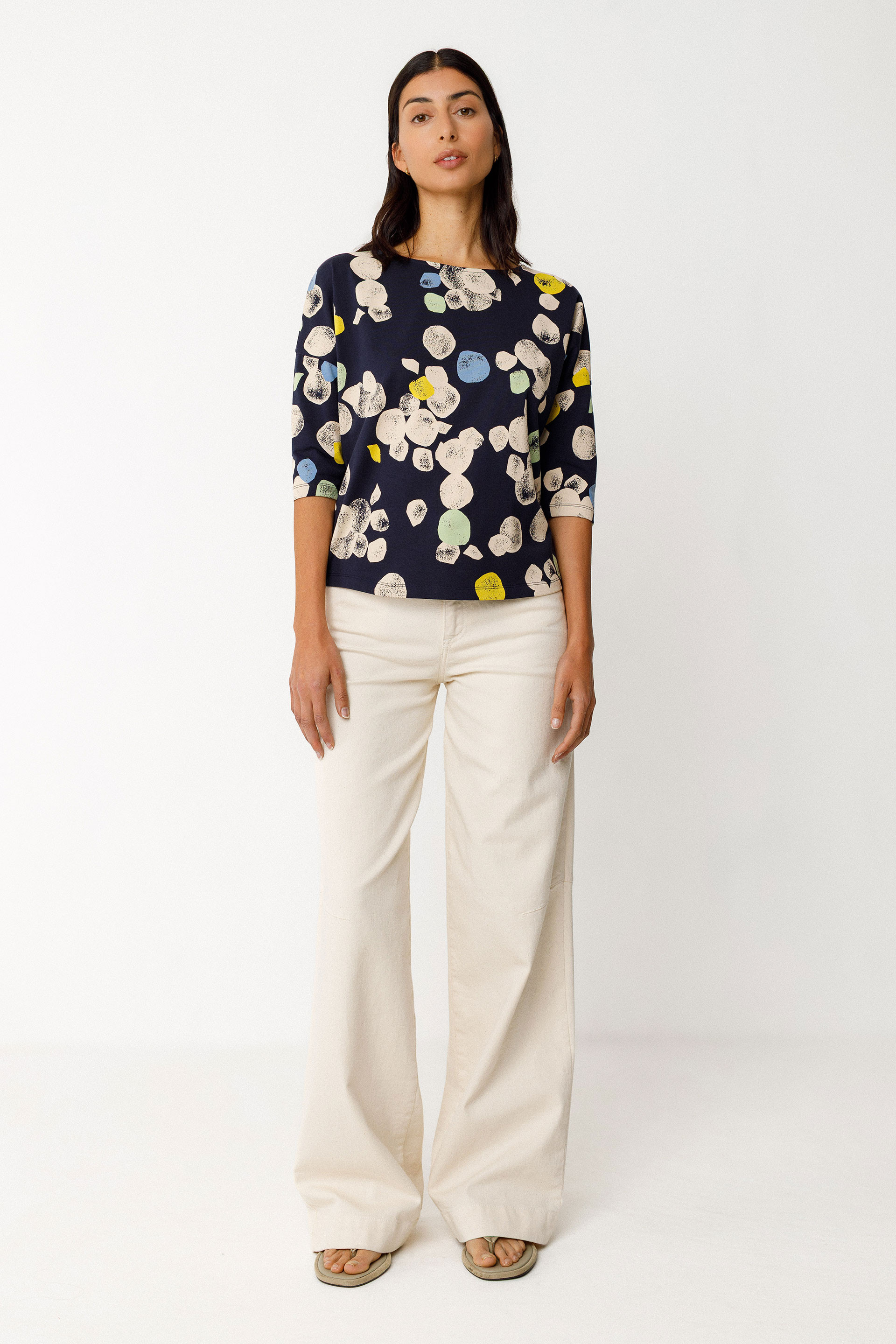 Ample t-shirt à col bateau et manches trois quarts, réalisé en coton biologique certifié GOTS.