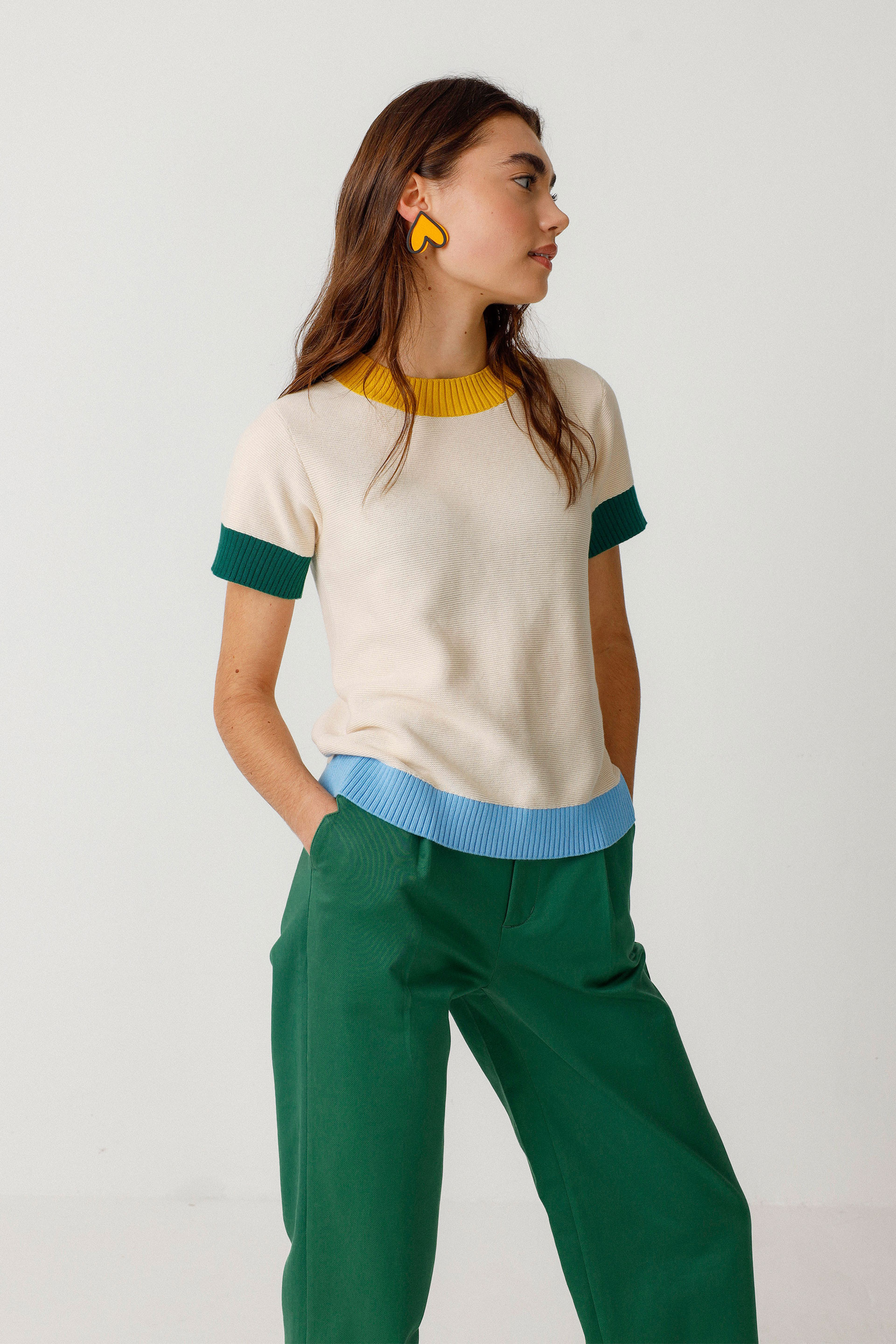 Haut en tricot léger avec un col rond et des manches courtes. Il se distingue par des finitions côtelées de couleur contrastante au col, aux revers et à la taille.