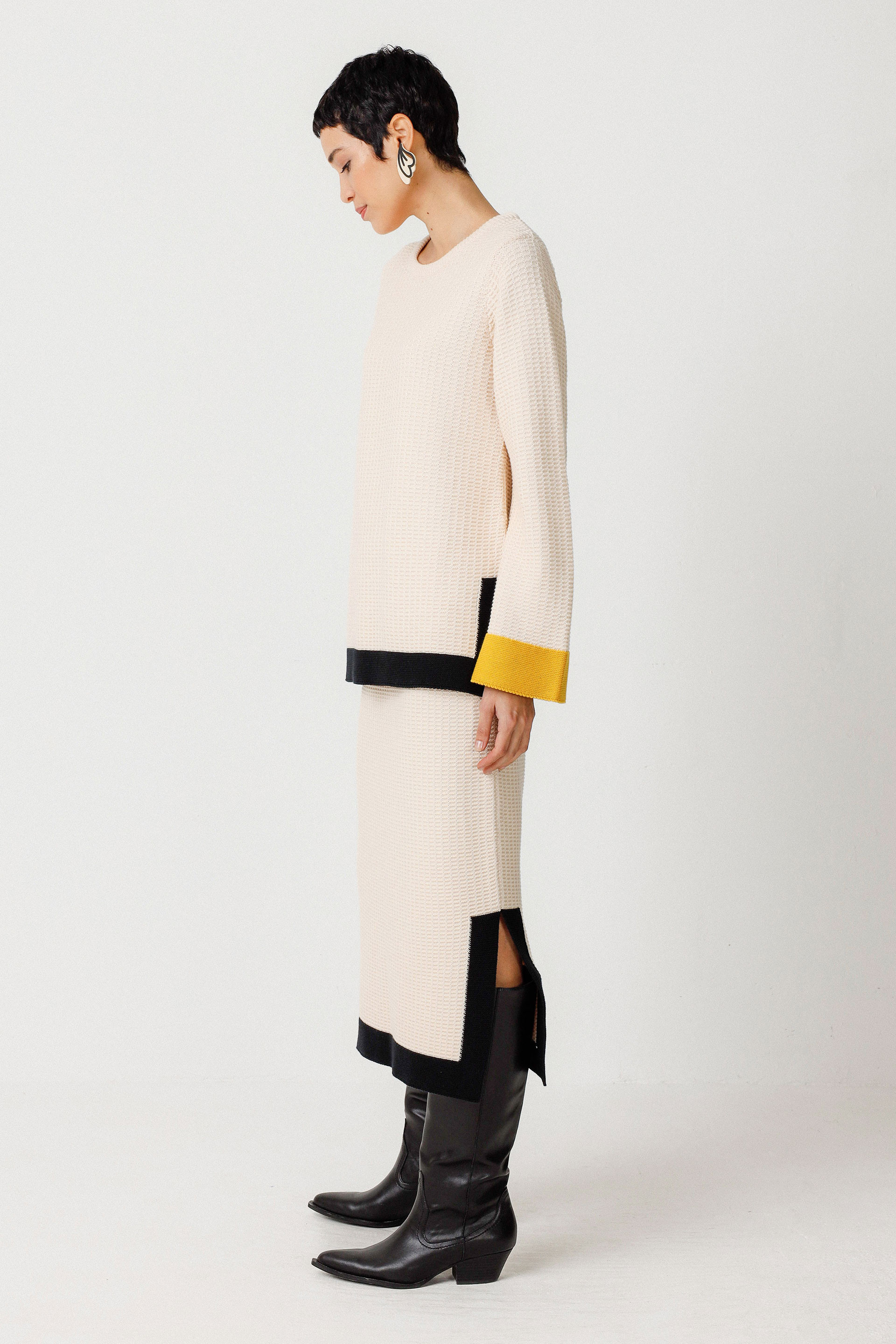 Pull épais à manches longues évasées et col rond. Silhouette flatteuse et coton biologique certifié GOTS.