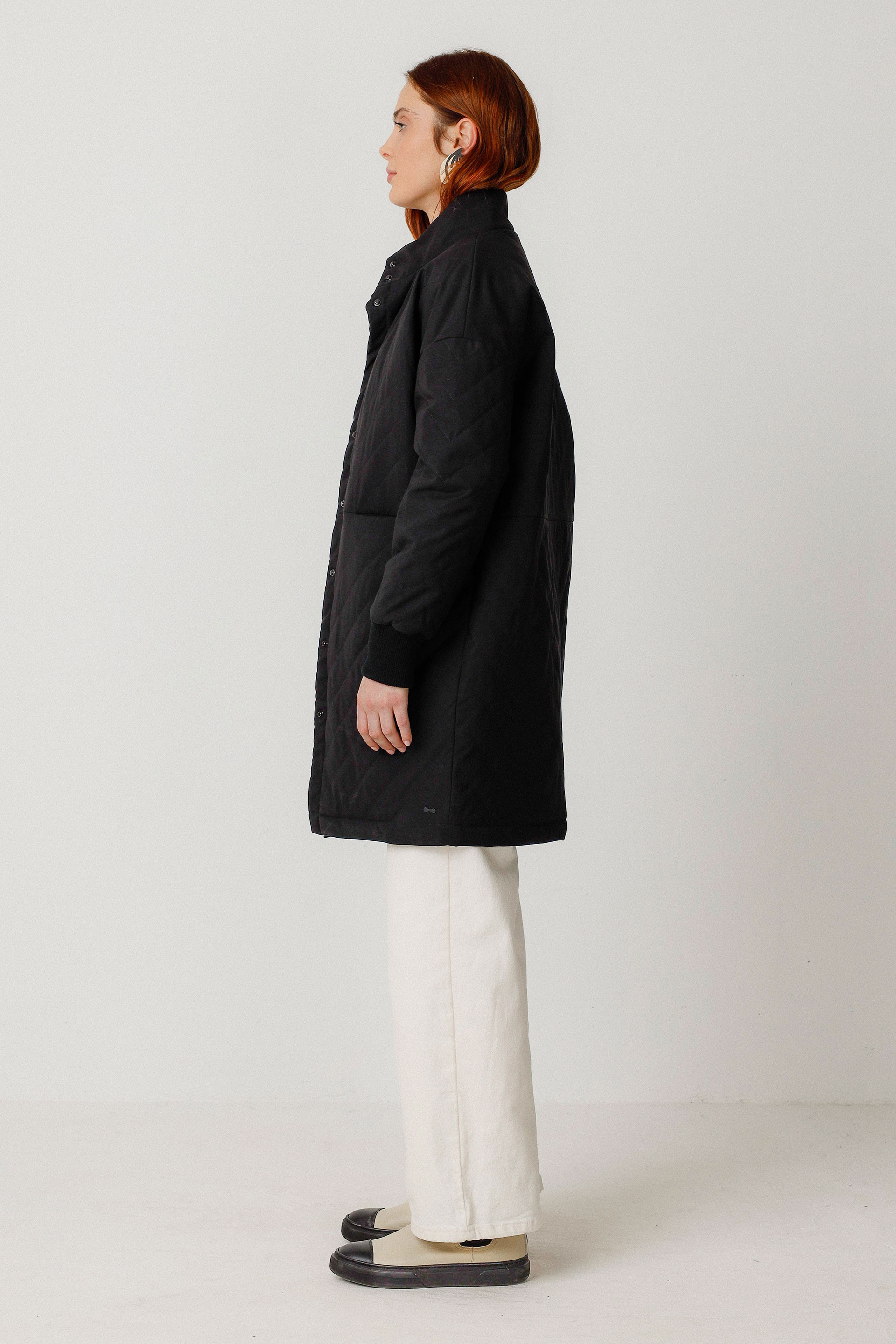 Manteau-cocon avec une coupe ample, un col montant et des manches longues dotées de poignets à côtes. Équipé de poches sur l’avant et d’une fermeture boutonnée, il est entièrement doublé et garni d’isolation Sorona.