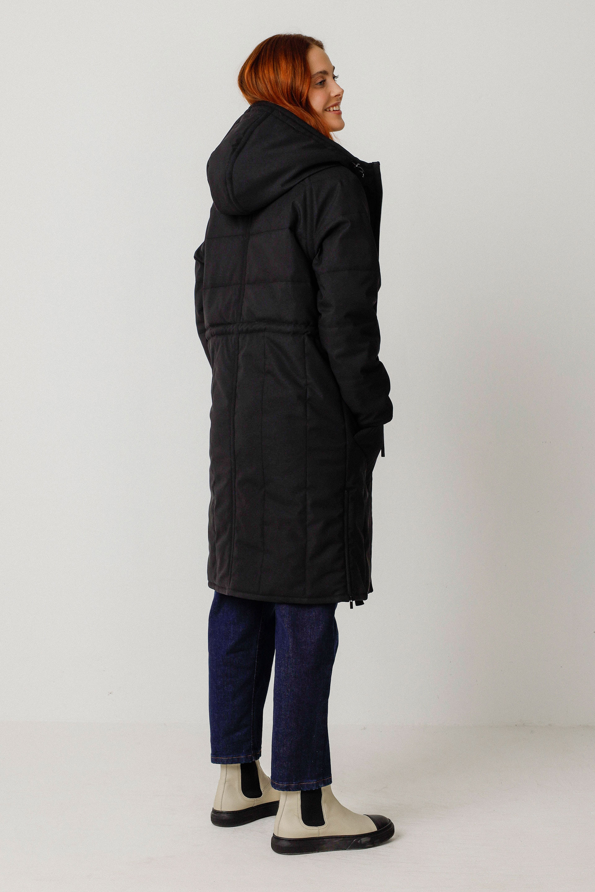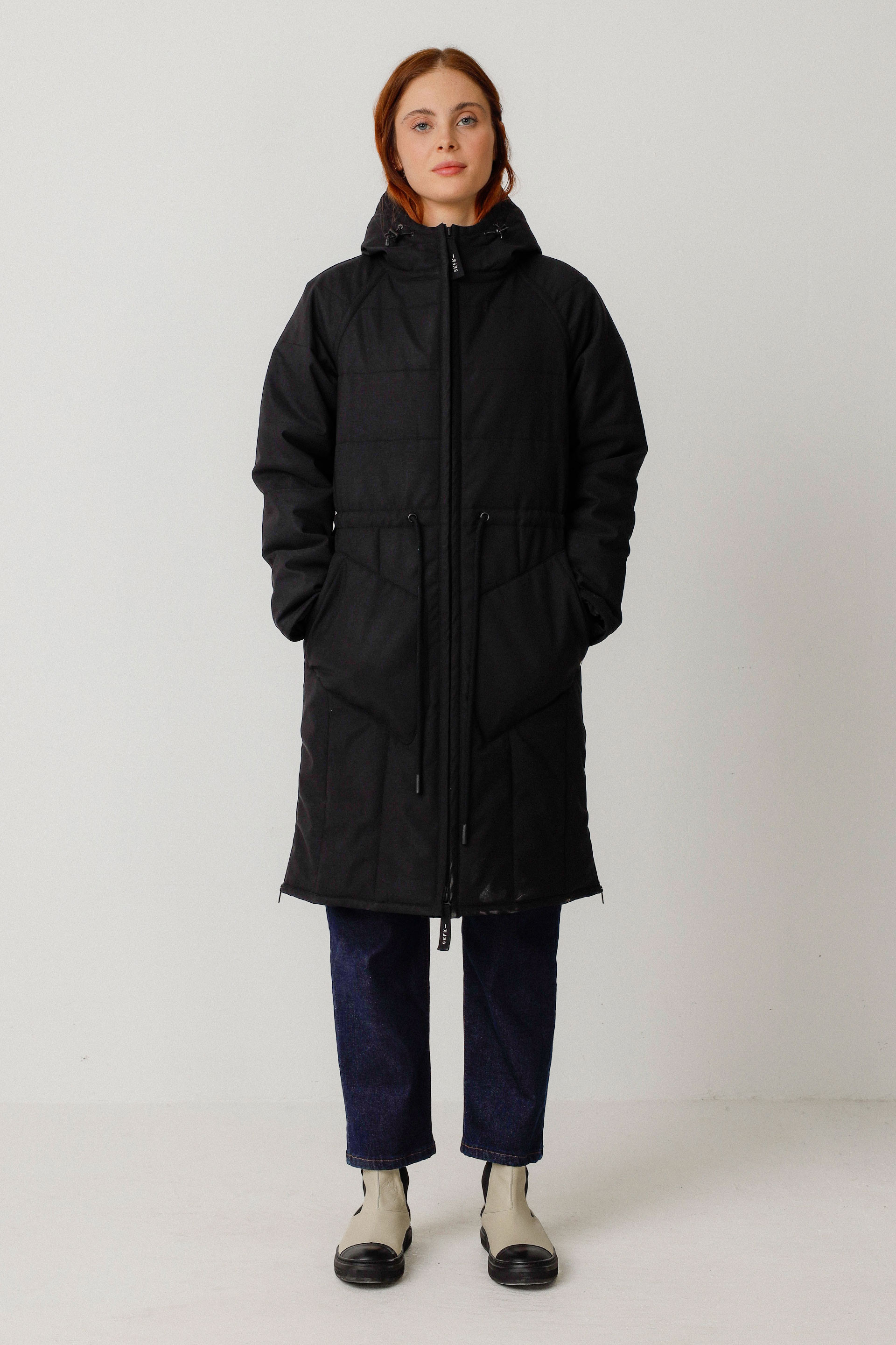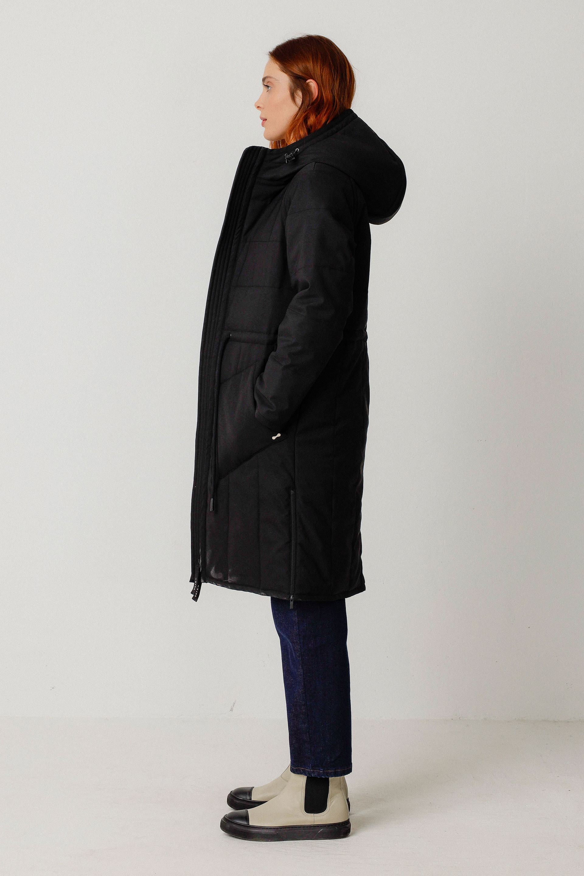 Long manteau matelassé imperméable avec une coupe droite, une capuche et des manches longues. Ajustable au niveau de la taille et de la capuche, ce modèle est entièrement doublé. Il est équipé de poches plaquées devant, d’une fermeture frontale zippée et de fentes d’aisance zippées sur les côtés.