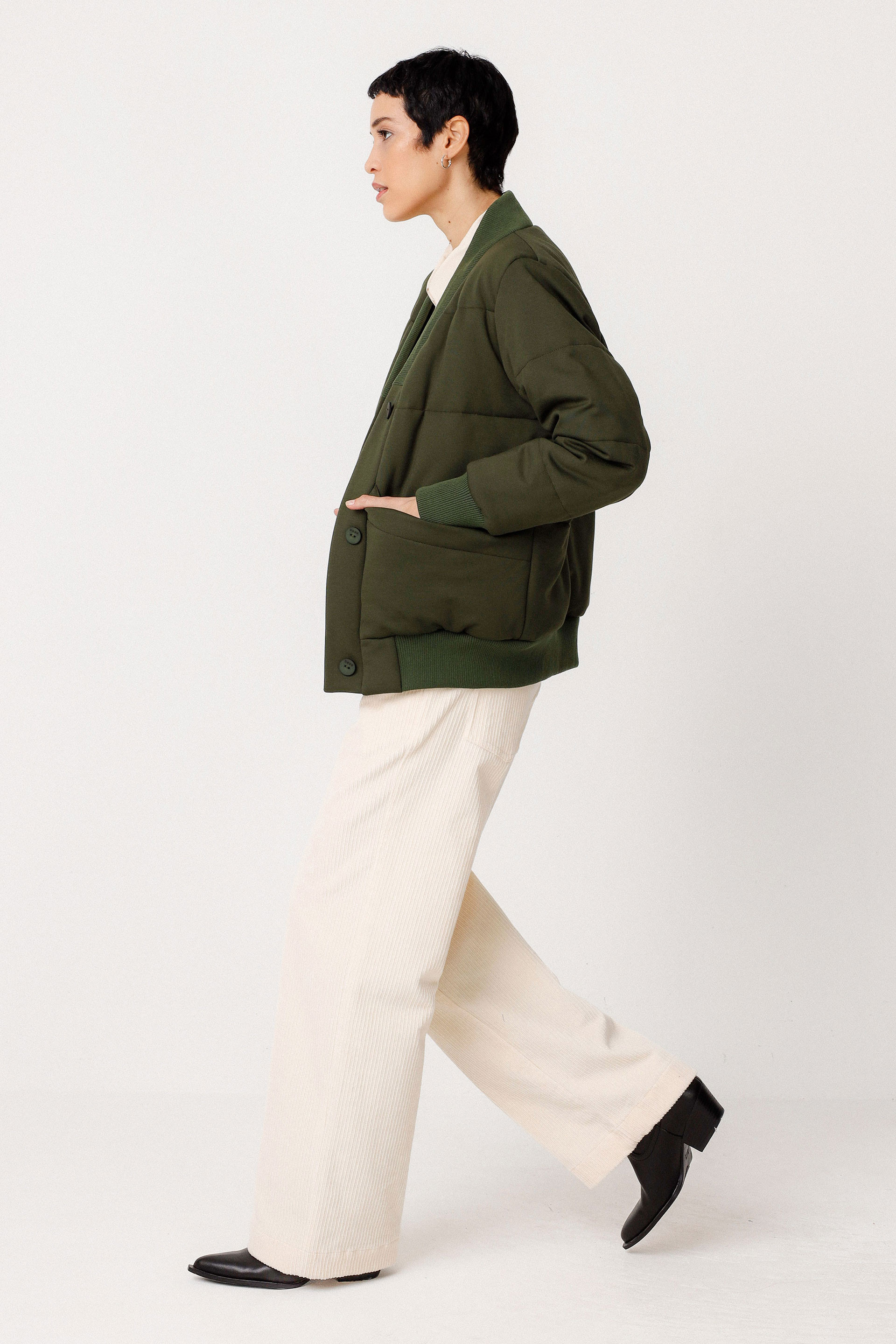 Veste bomber coupe boyfriend avec un col côtelé, des poches plaquées et une fermeture avant boutonnée. Chaleur et style original.