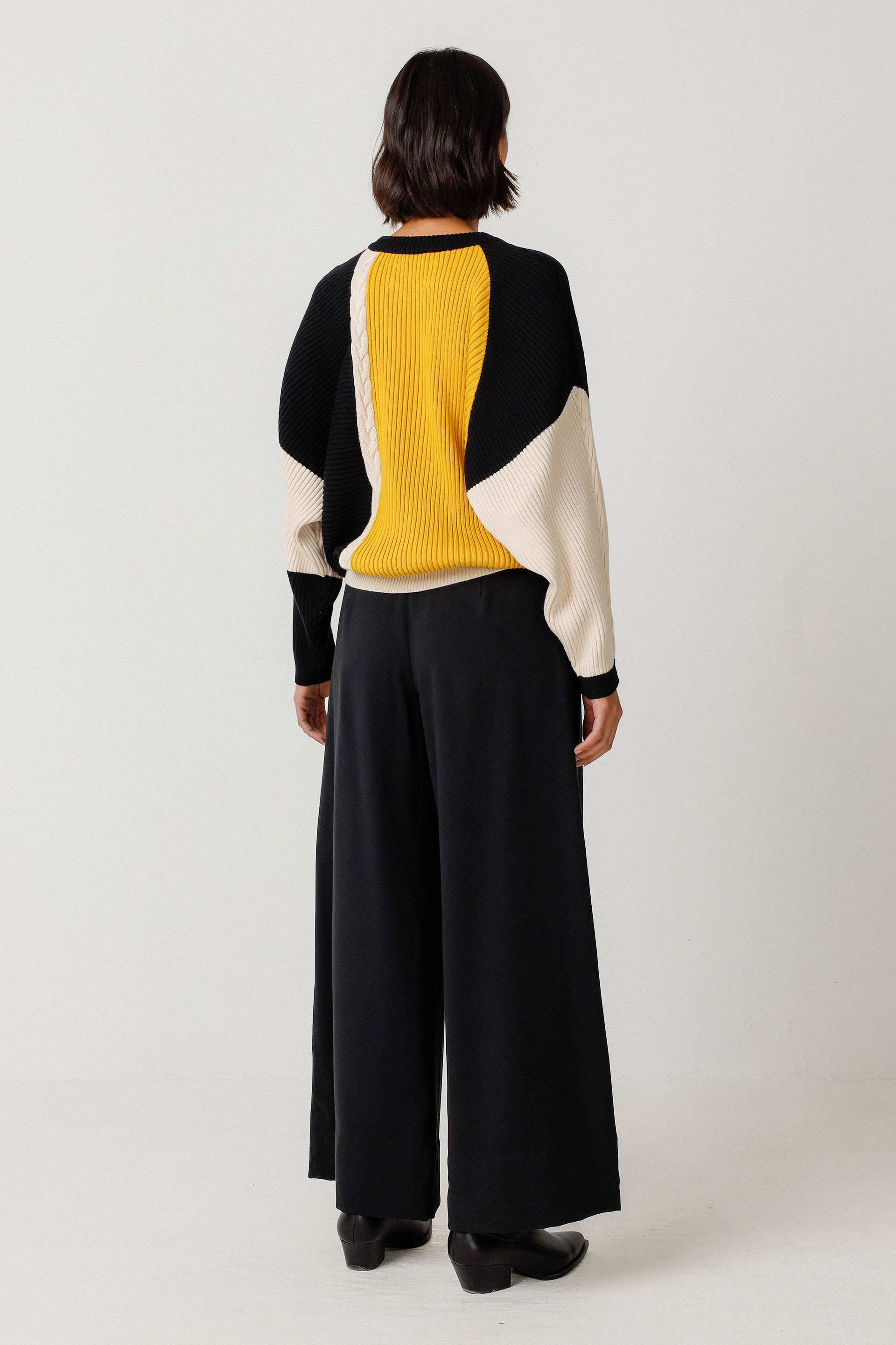 Ample pull semi-épais en tricot multicolore doté de manches chauve-souris et d’un col rond. Si confortable que vous ne vous en passerez plus. Coton biologique certifié GOTS.