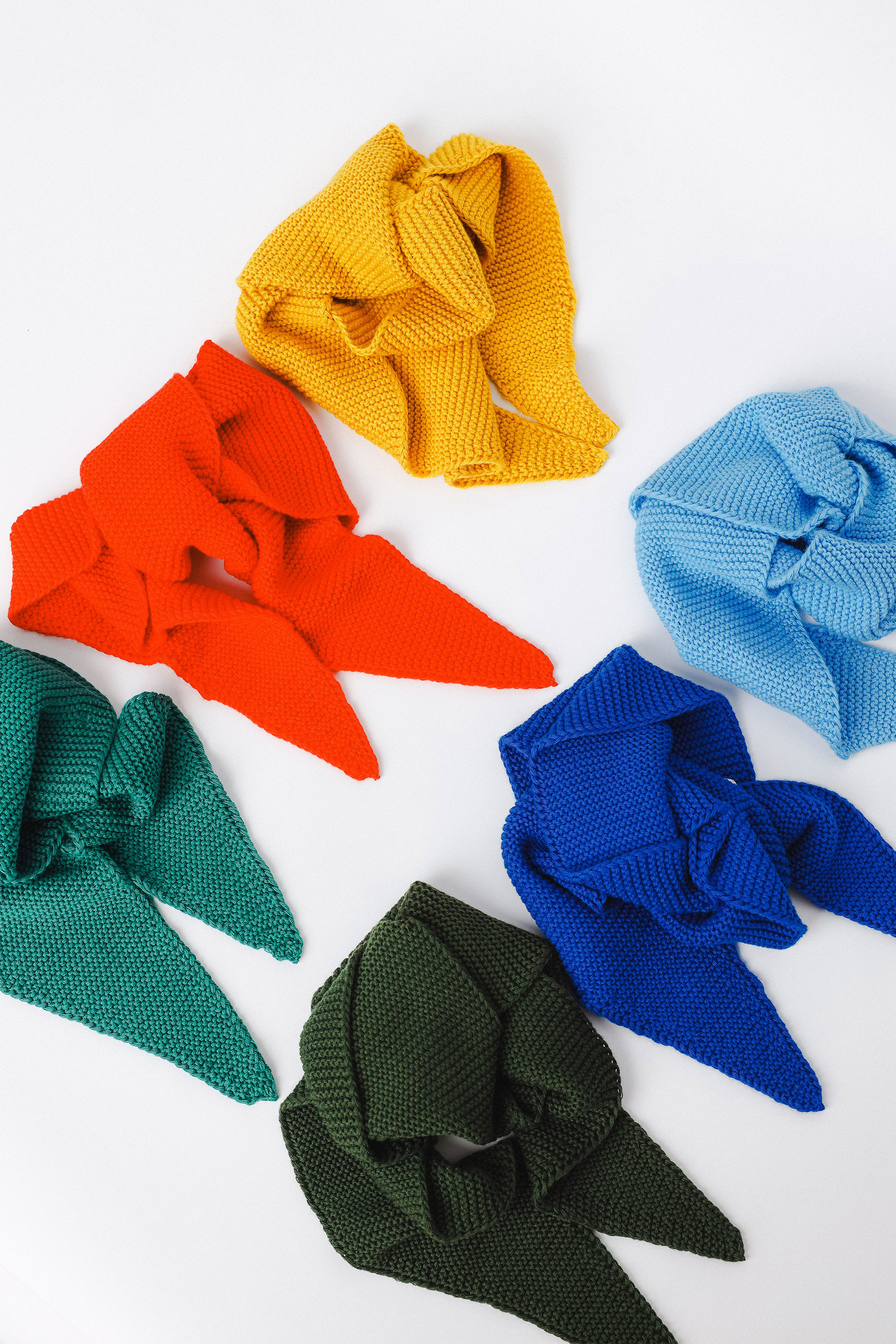 Petite écharpe en tricot unie, plus large au centre et fine aux extrémités. Un complément élégant et polyvalent. Coton biologique certifié GOTS.