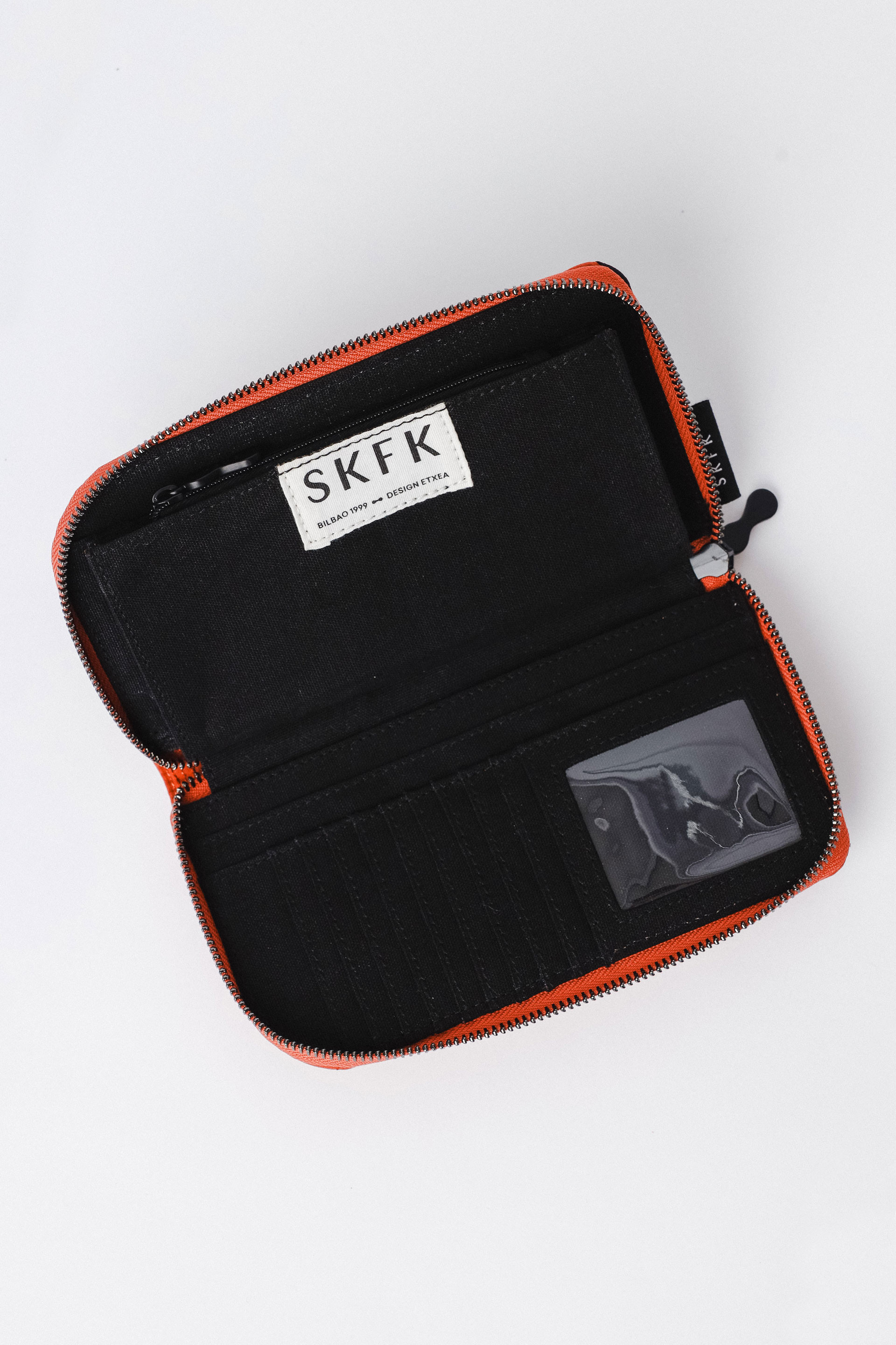 Portefeuille en polyester recyclé avec une fermeture zippée, un porte-cartes à l’intérieur et une poche pour la monnaie. Conception responsable et fonctionnalité.