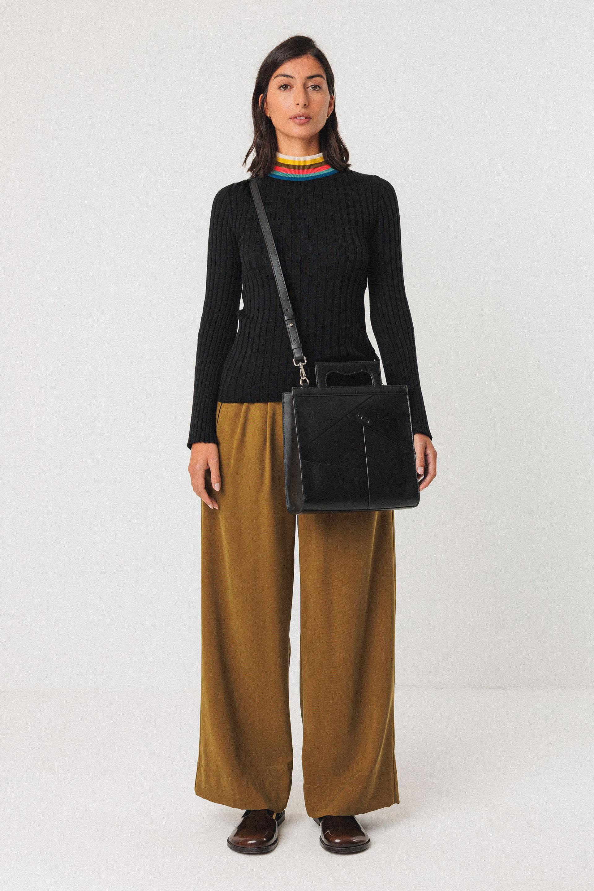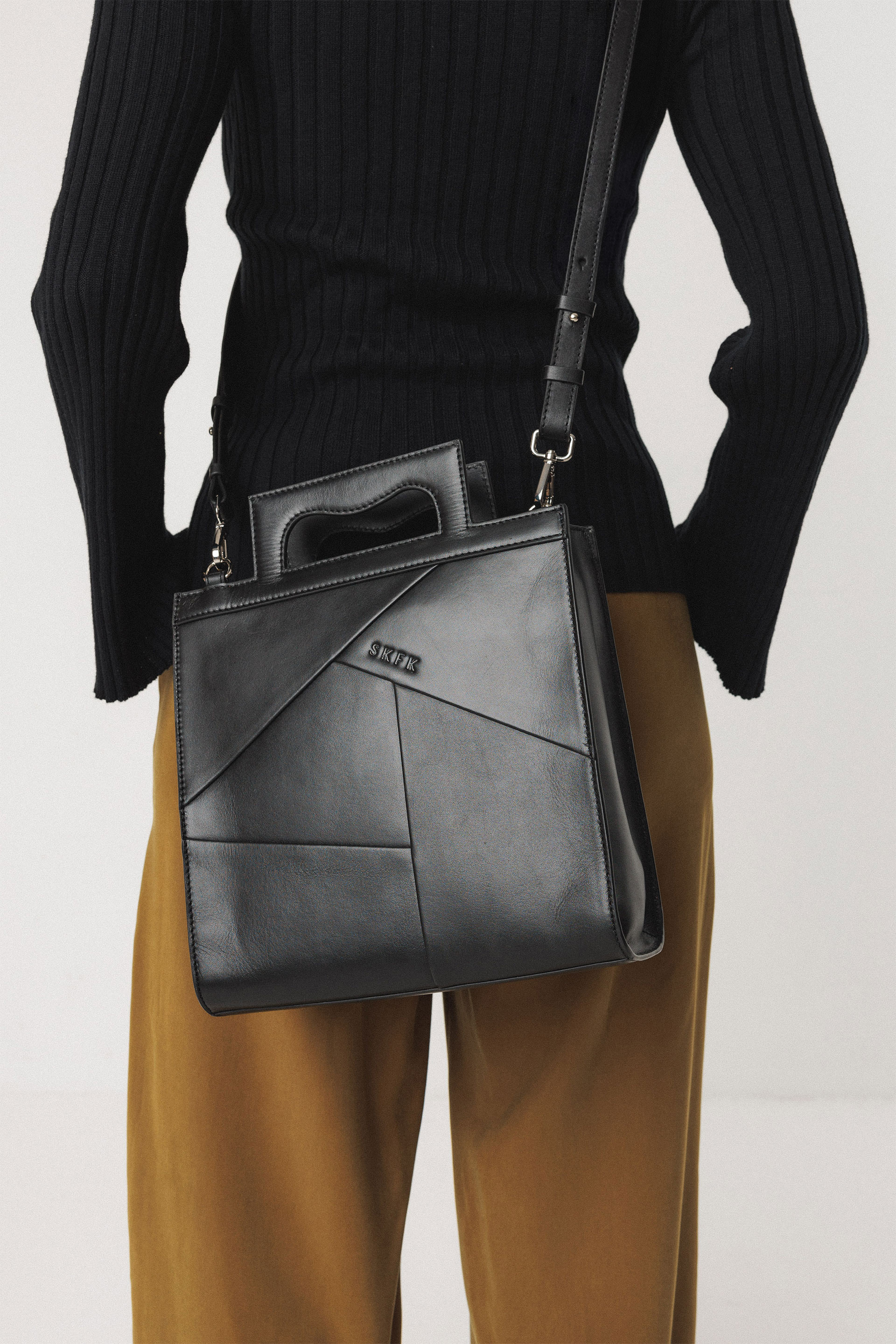 Sac carré équipé de deux poches à l’intérieur. Une anse et une sangle ajustable permettent de le porter à la main ou en bandoulière. Dimensions : 25 x 30 x 10 cm.