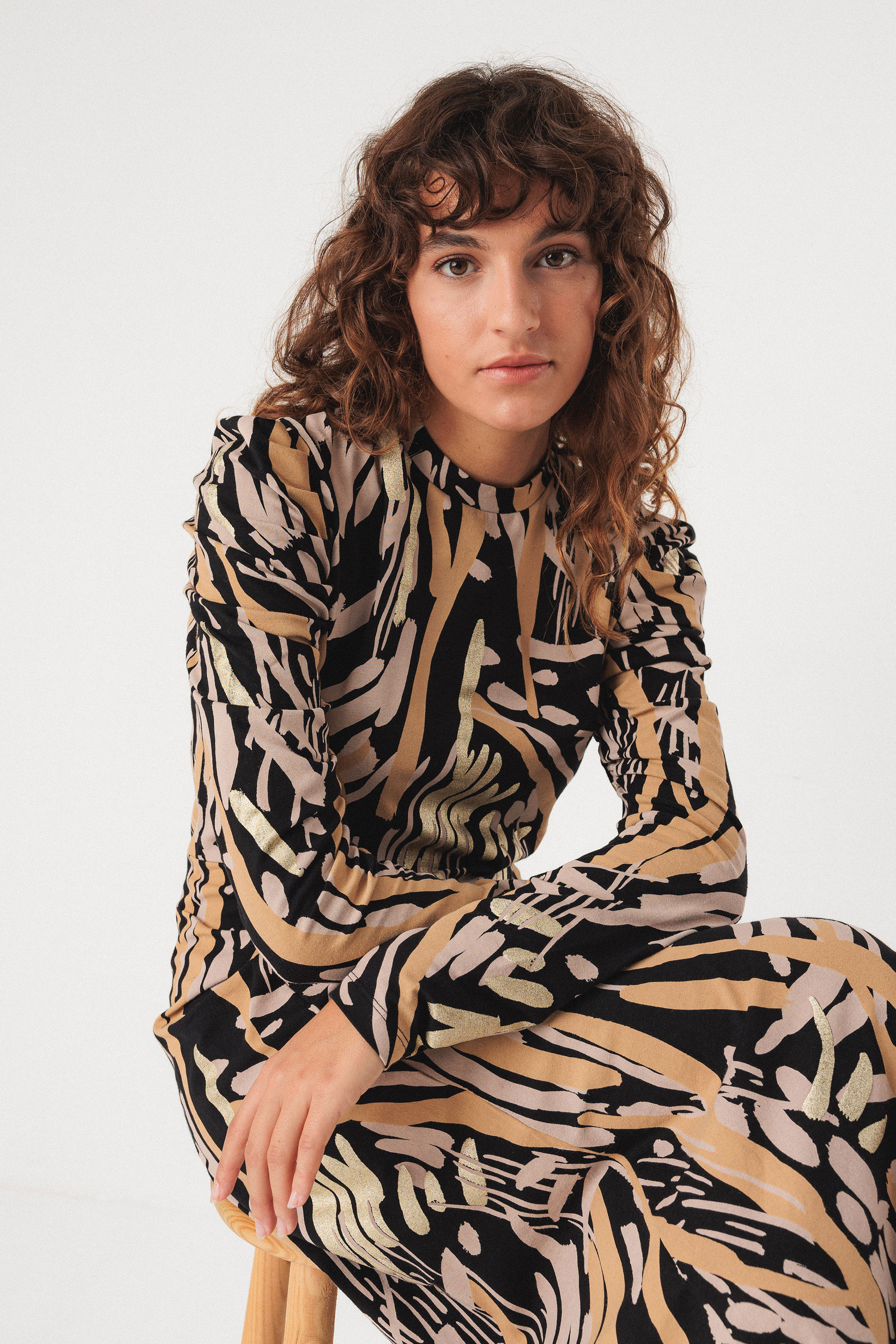 Robe mi-longue en coton biologique stretch. Manches longues avec des fronces au niveau de l'épaule et jupe évasée.