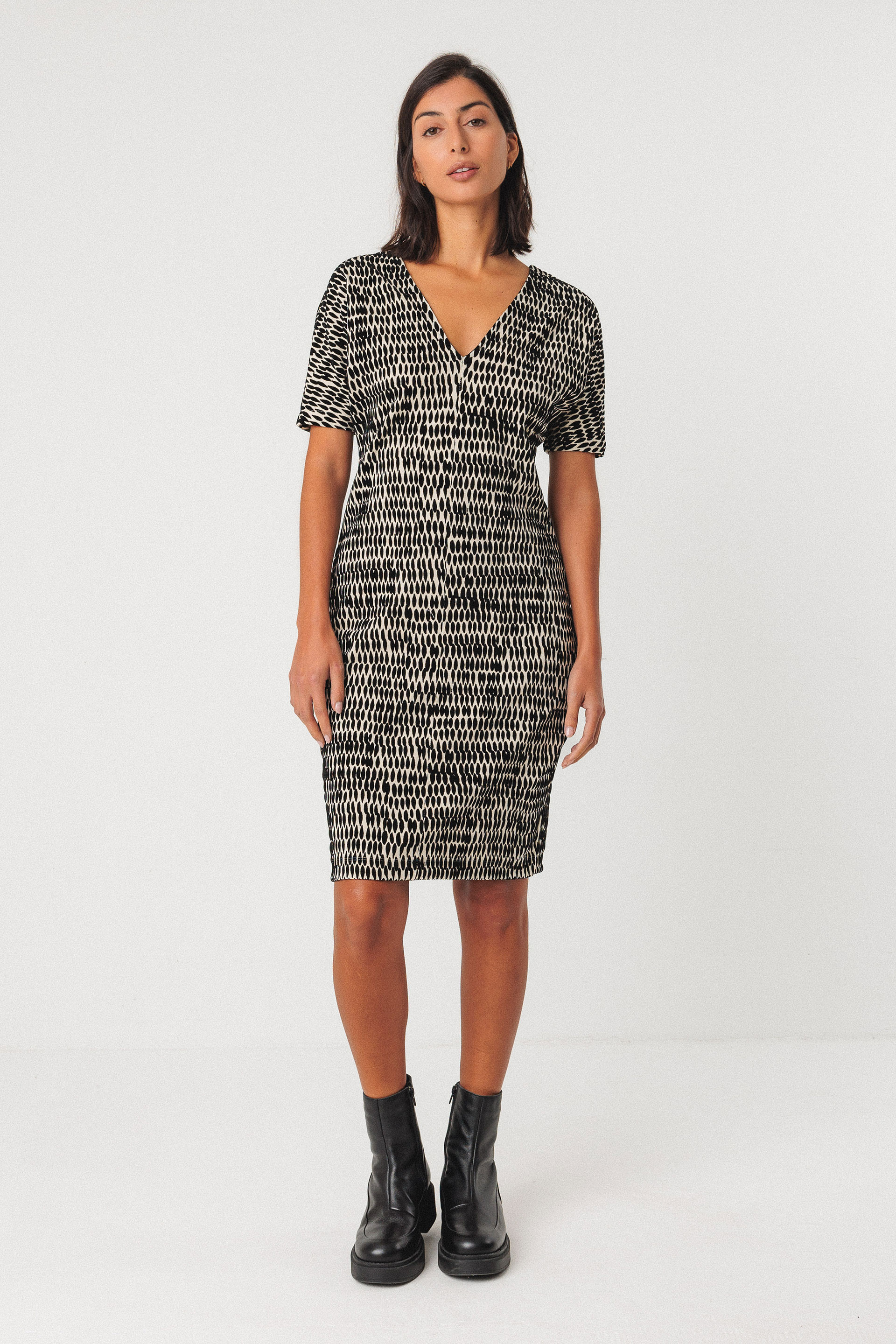 Robe ajustée en coton biologique stretch, coupée au dessus du genou. Elle présente un col V et une découpe en V dans le dos, ainsi que des manches chauve-souris courtes.