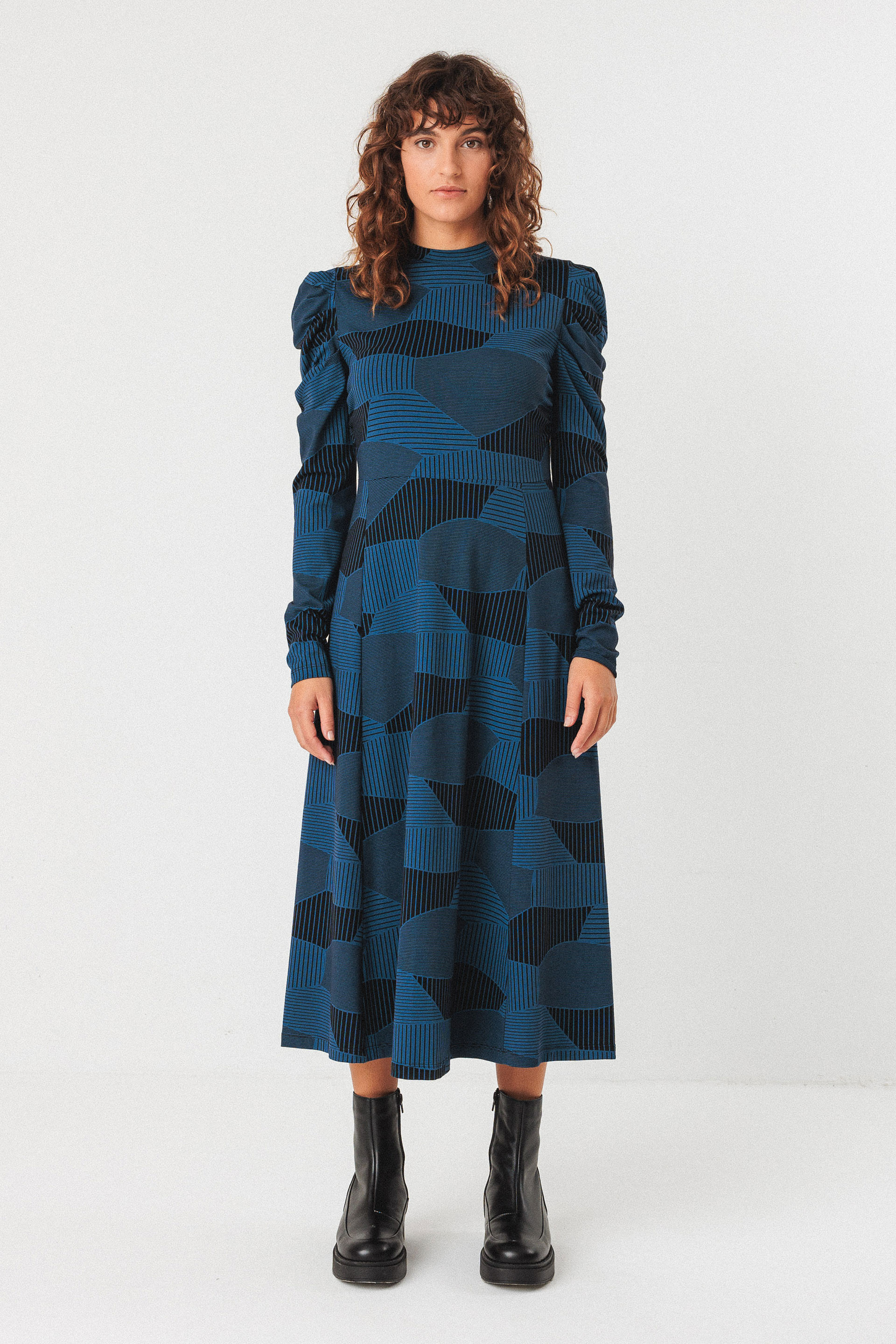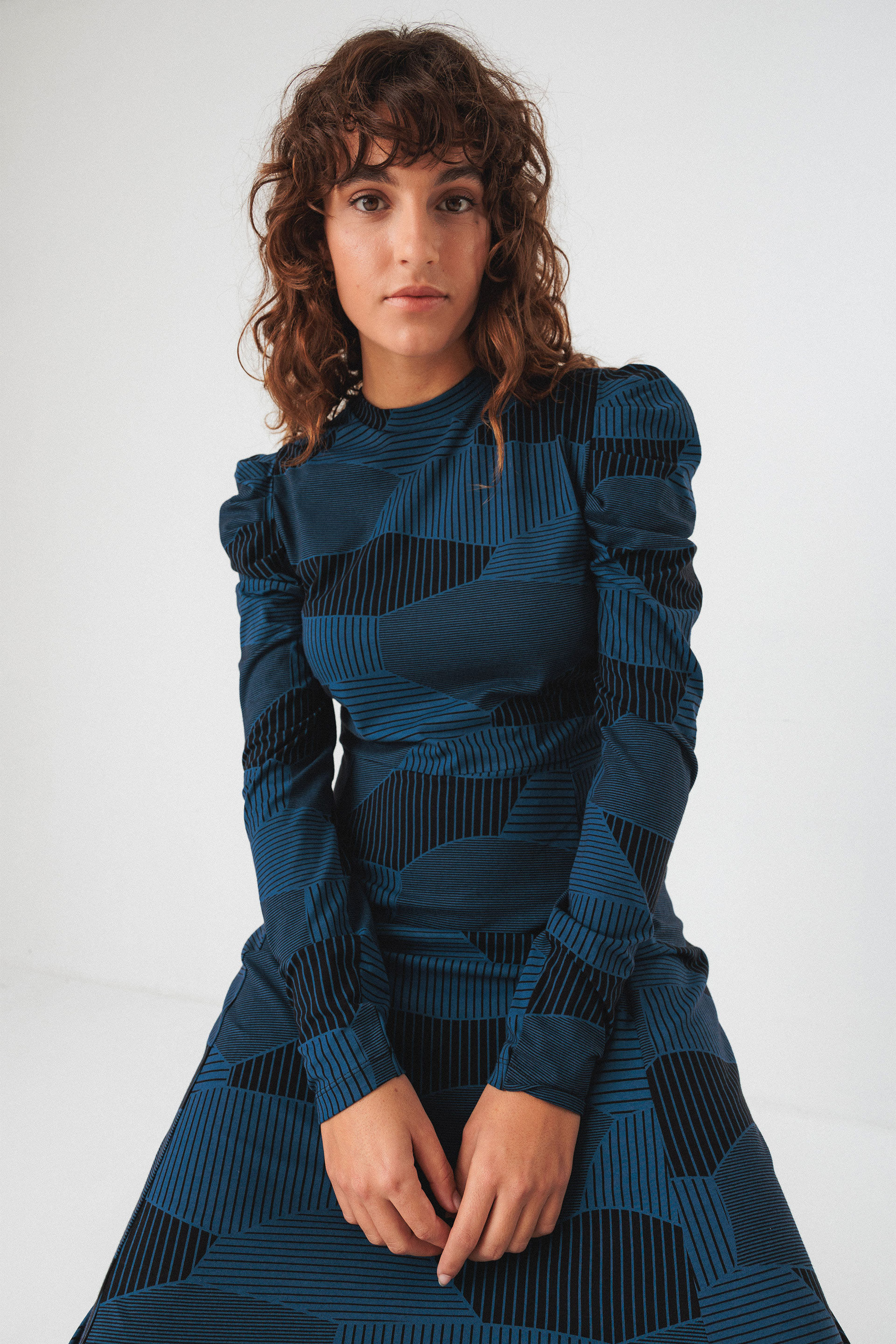 Robe mi-longue en coton biologique stretch. Manches longues avec des fronces au niveau de l'épaule et jupe évasée.
