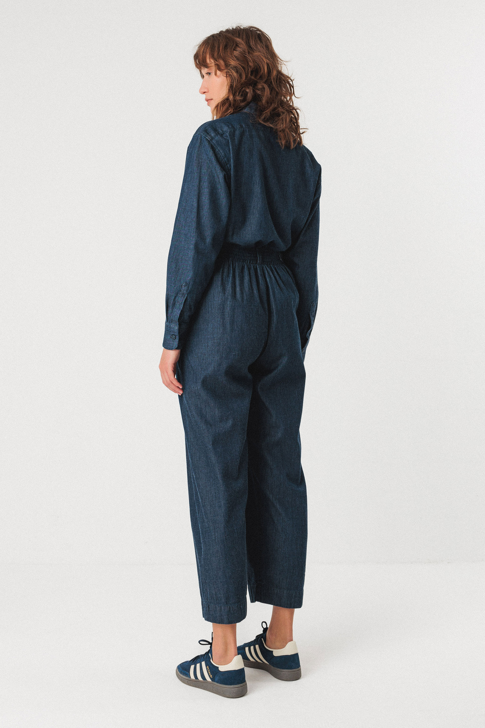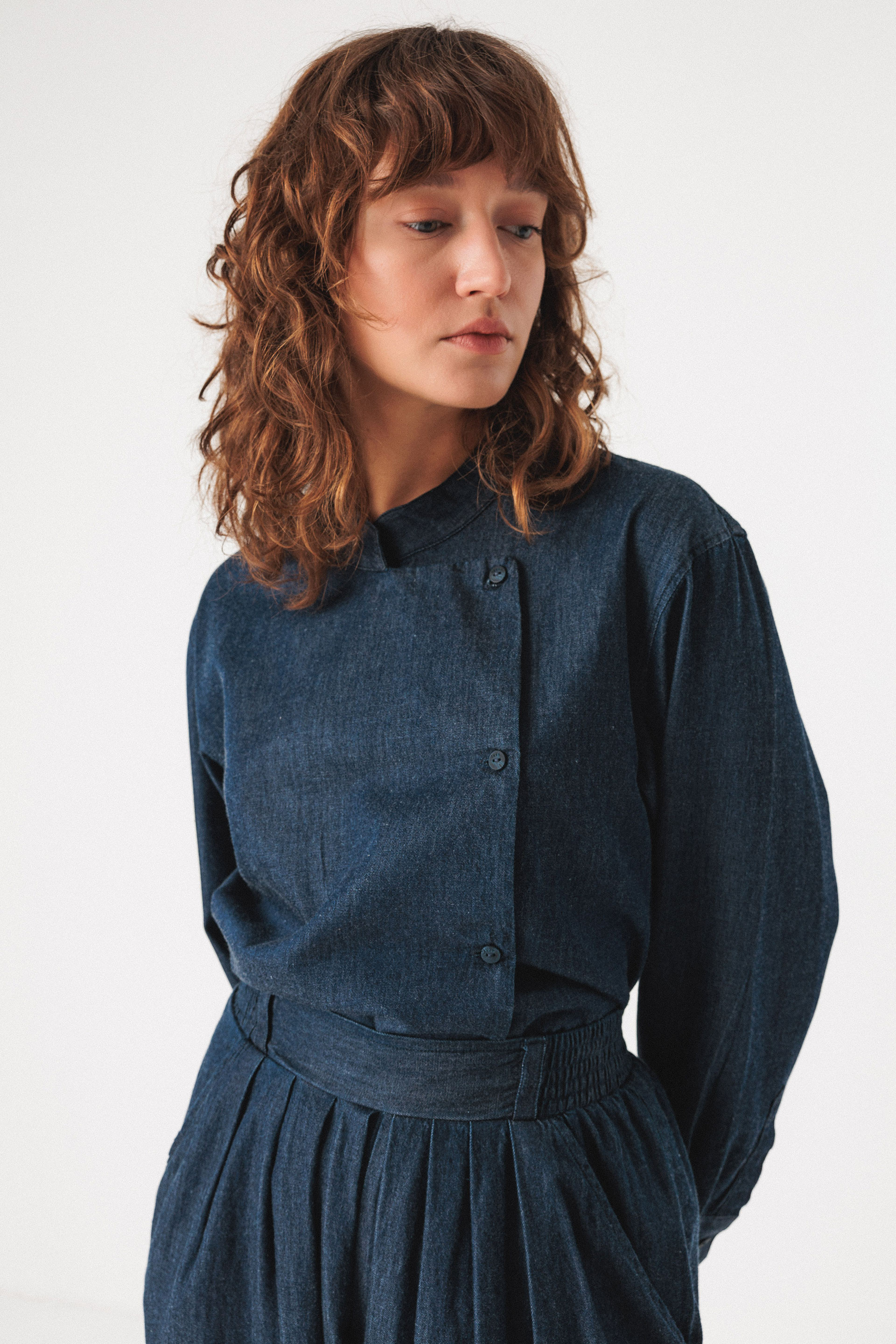 Chemise en denim légère à coupe droite, confectionnée en coton biologique certifié GOTS. Elle affiche un col mao, des manches longues et une fermeture boutonnée sur l’avant.