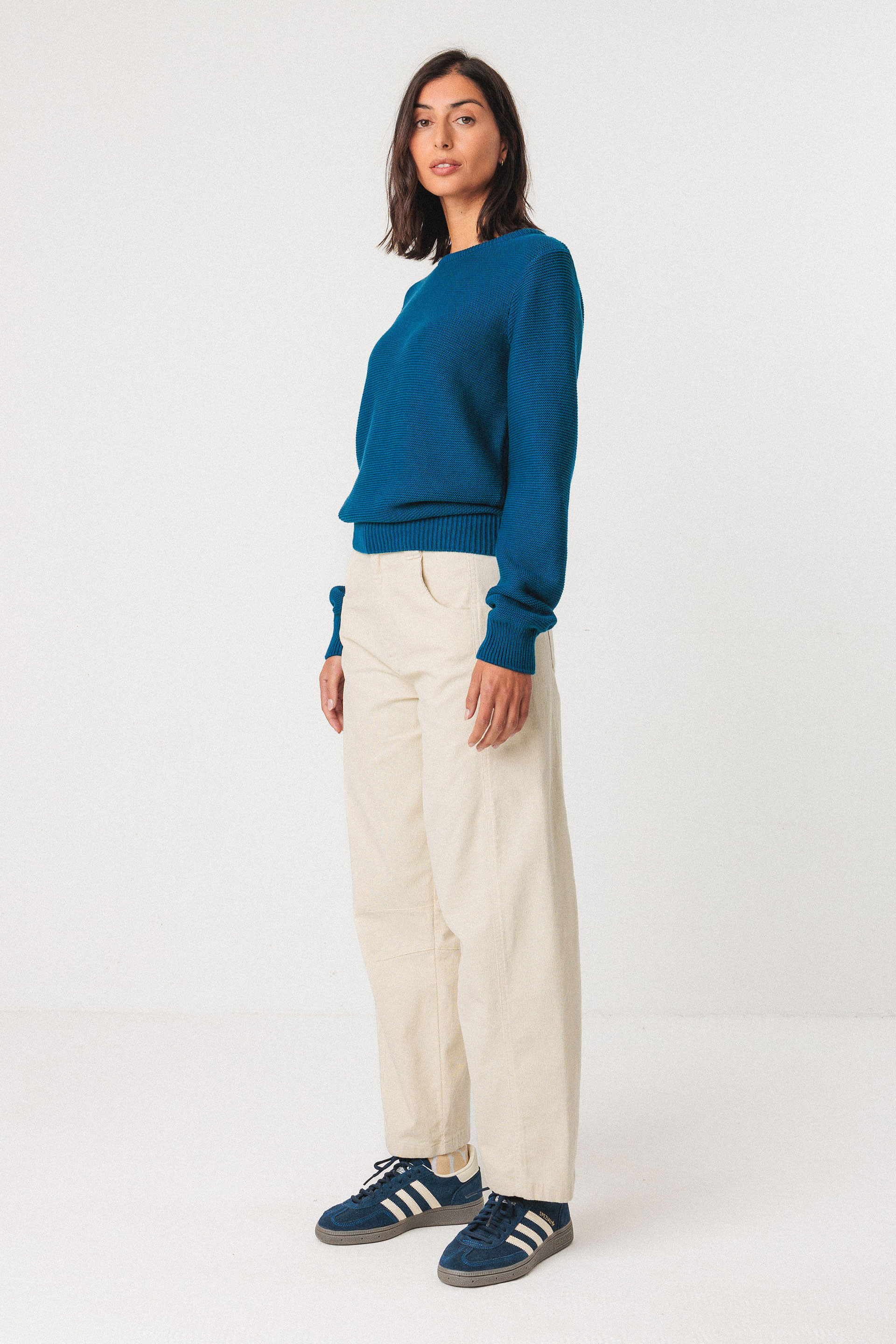 Pull en tricot de coton biologique certifié GOTS avec un col rond, des manches longues et des finitions en tricot à côtes au col, à la taille et aux poignets.