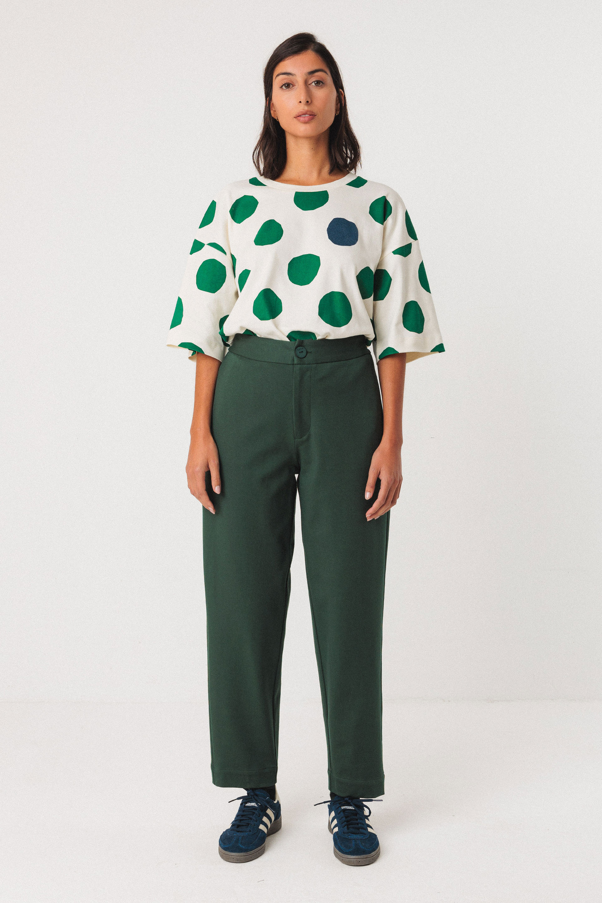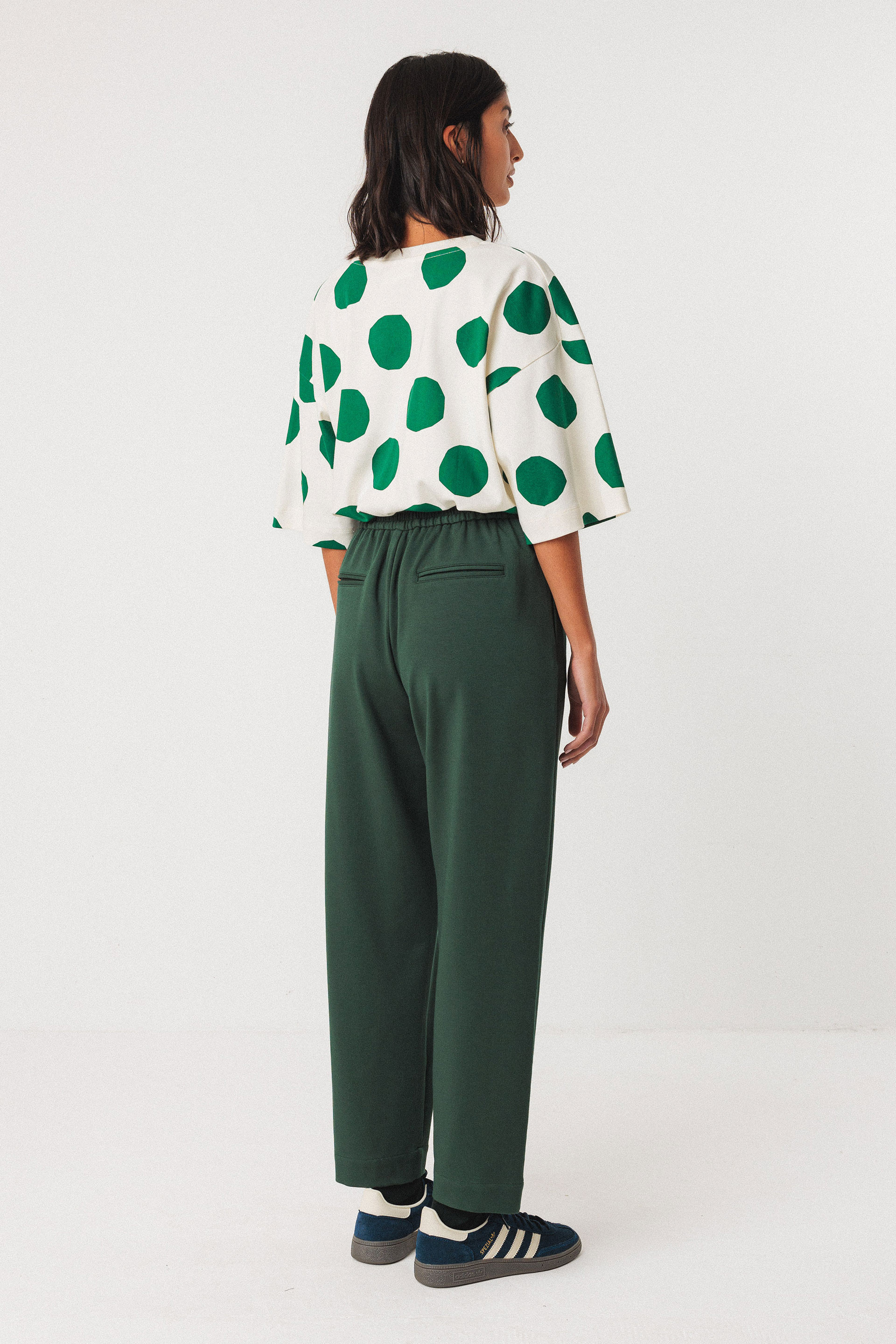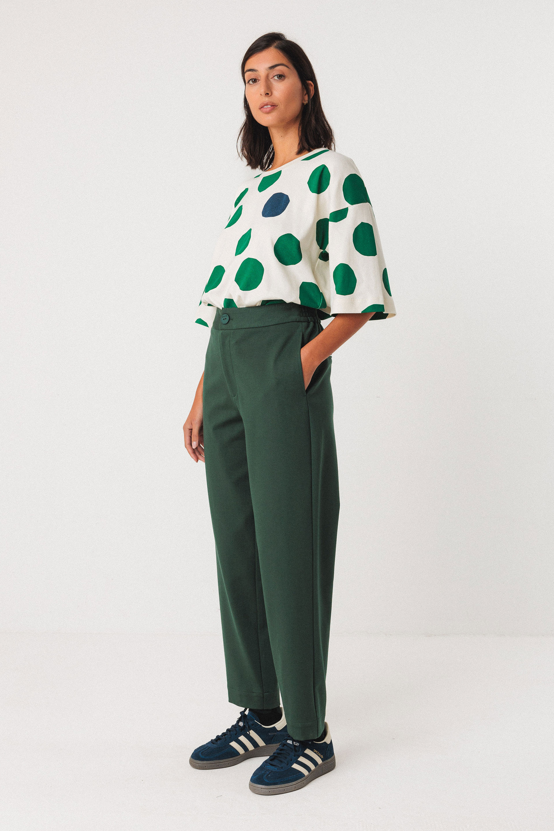 Pantalon coupe carotte coupé à la cheville. Il présente une braguette zippée devant, une zone élastiquée au dos de la taille et de fausses poches passpoilées au dos.
