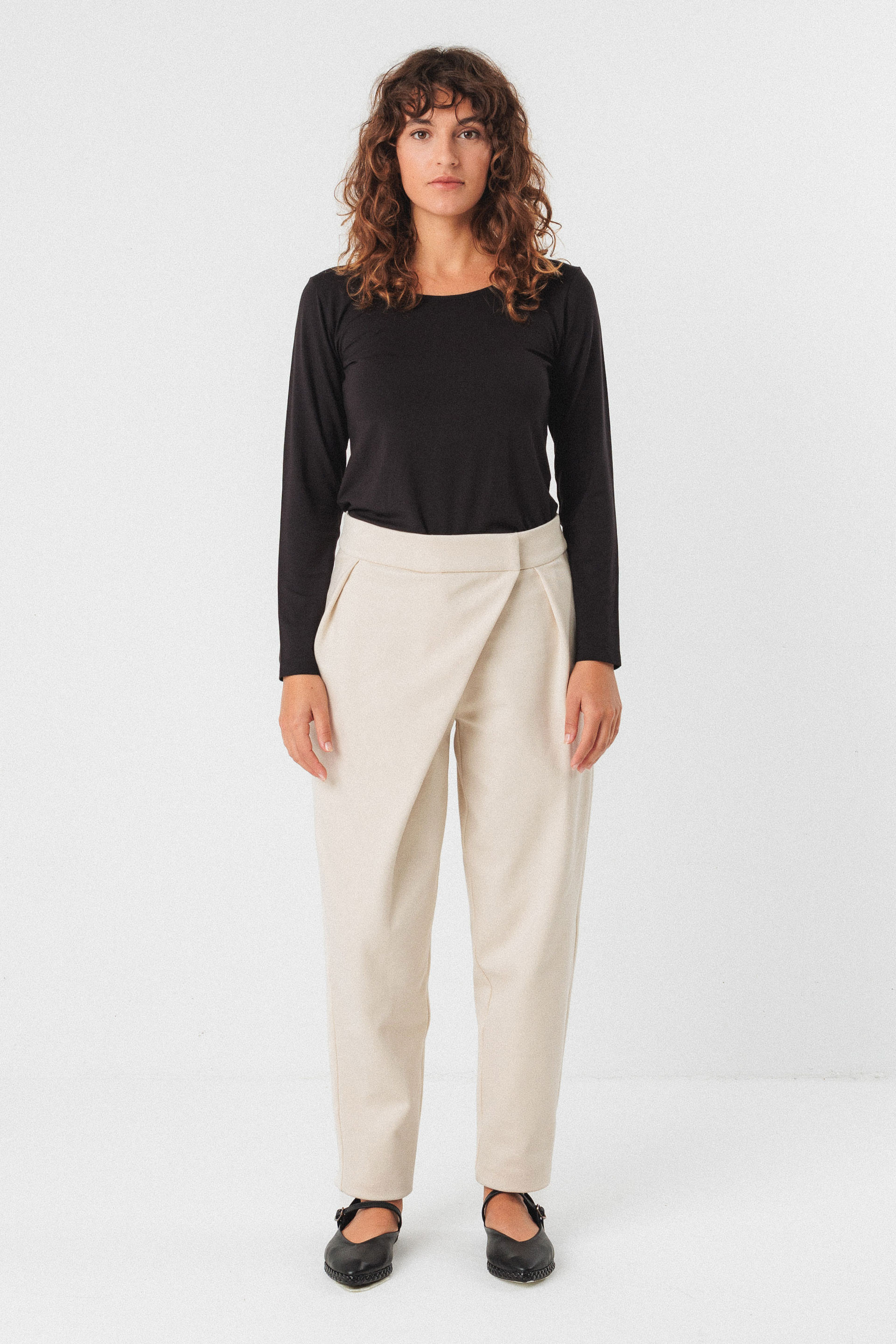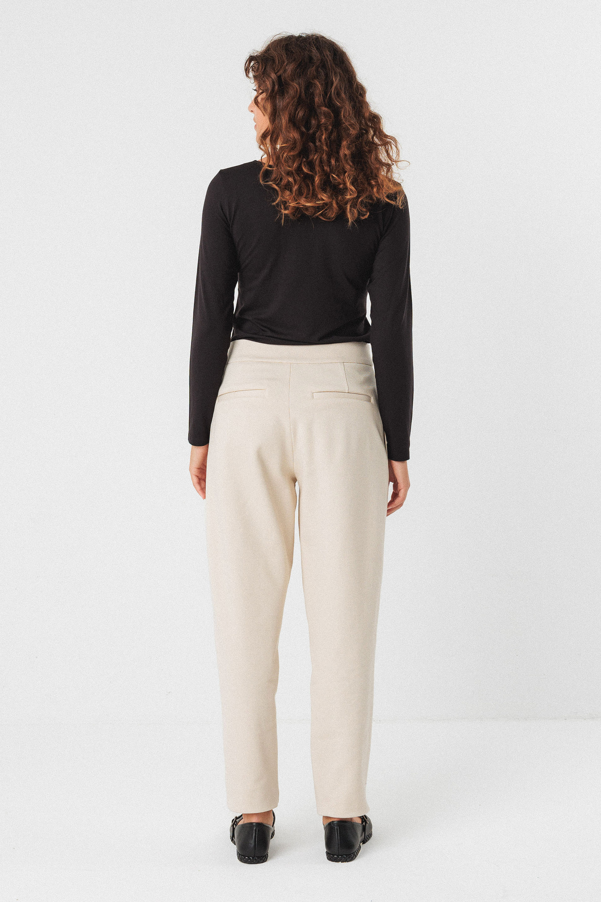 Pantalon coupé à la cheville avec un large pli sur l’avant. Braguette avec zip et bouton devant, poches sur les coutures de côté et fausses poches au dos.