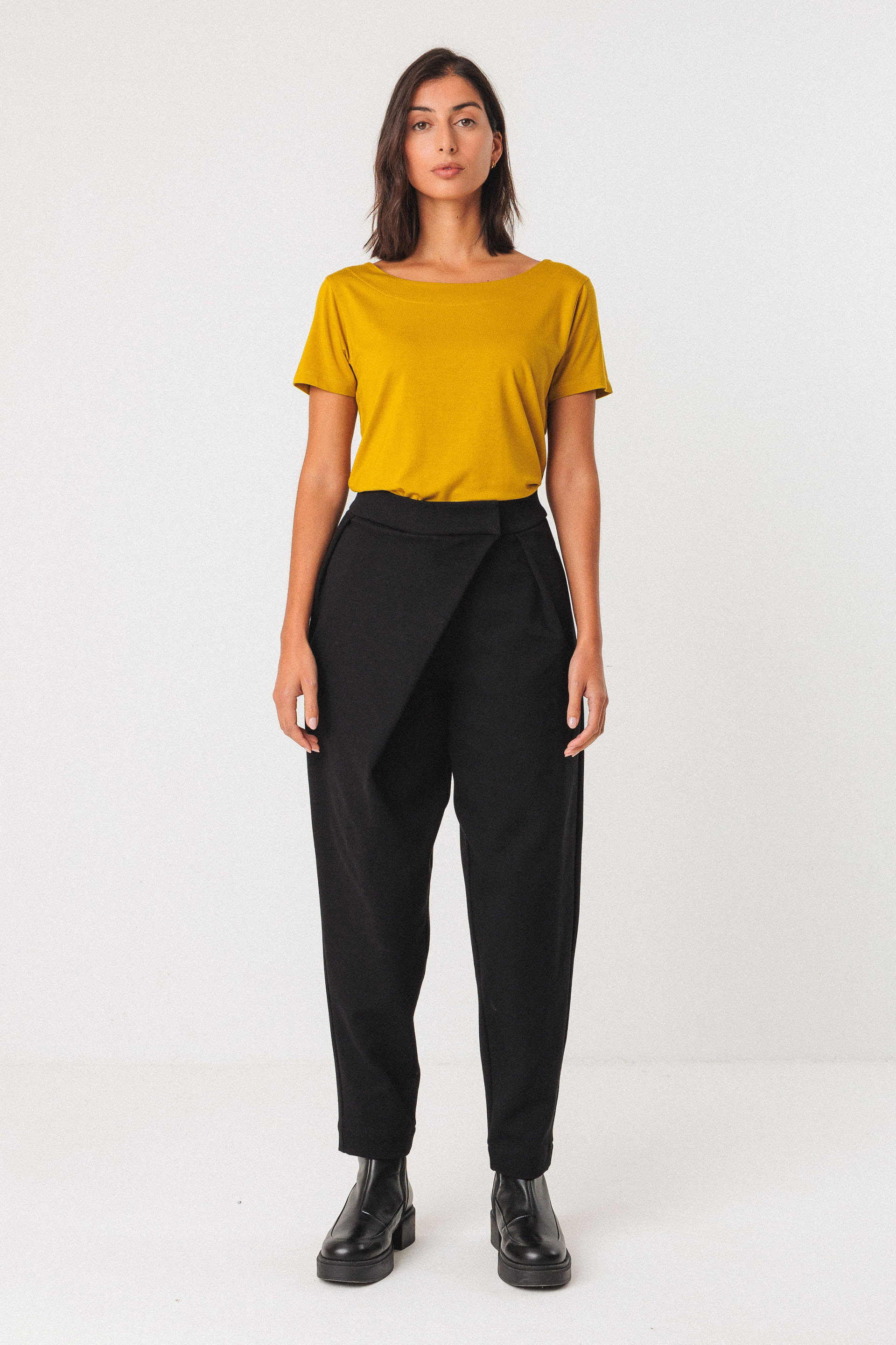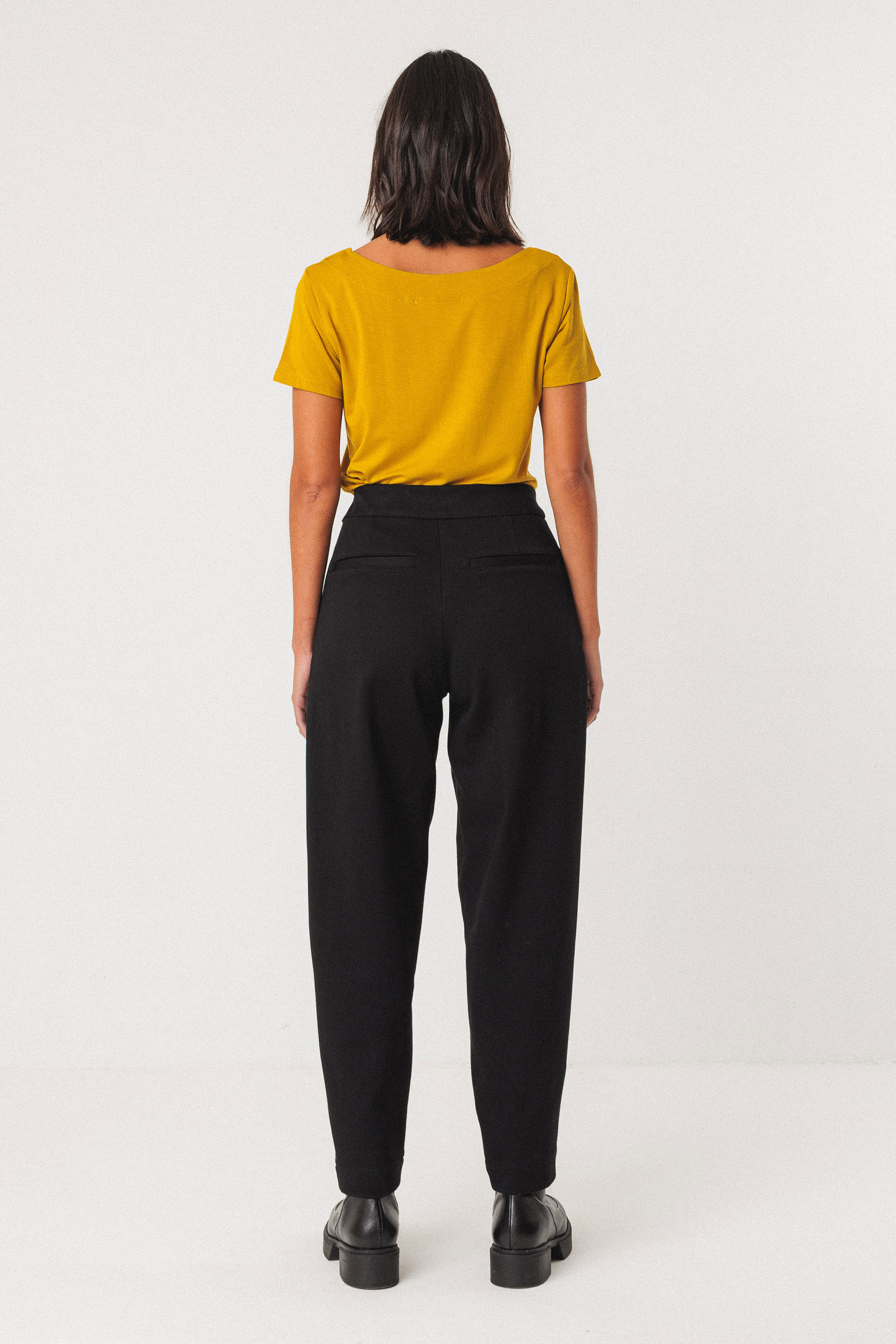 Pantalon coupé à la cheville avec un large pli sur l’avant. Braguette avec zip et bouton devant, poches sur les coutures de côté et fausses poches au dos.