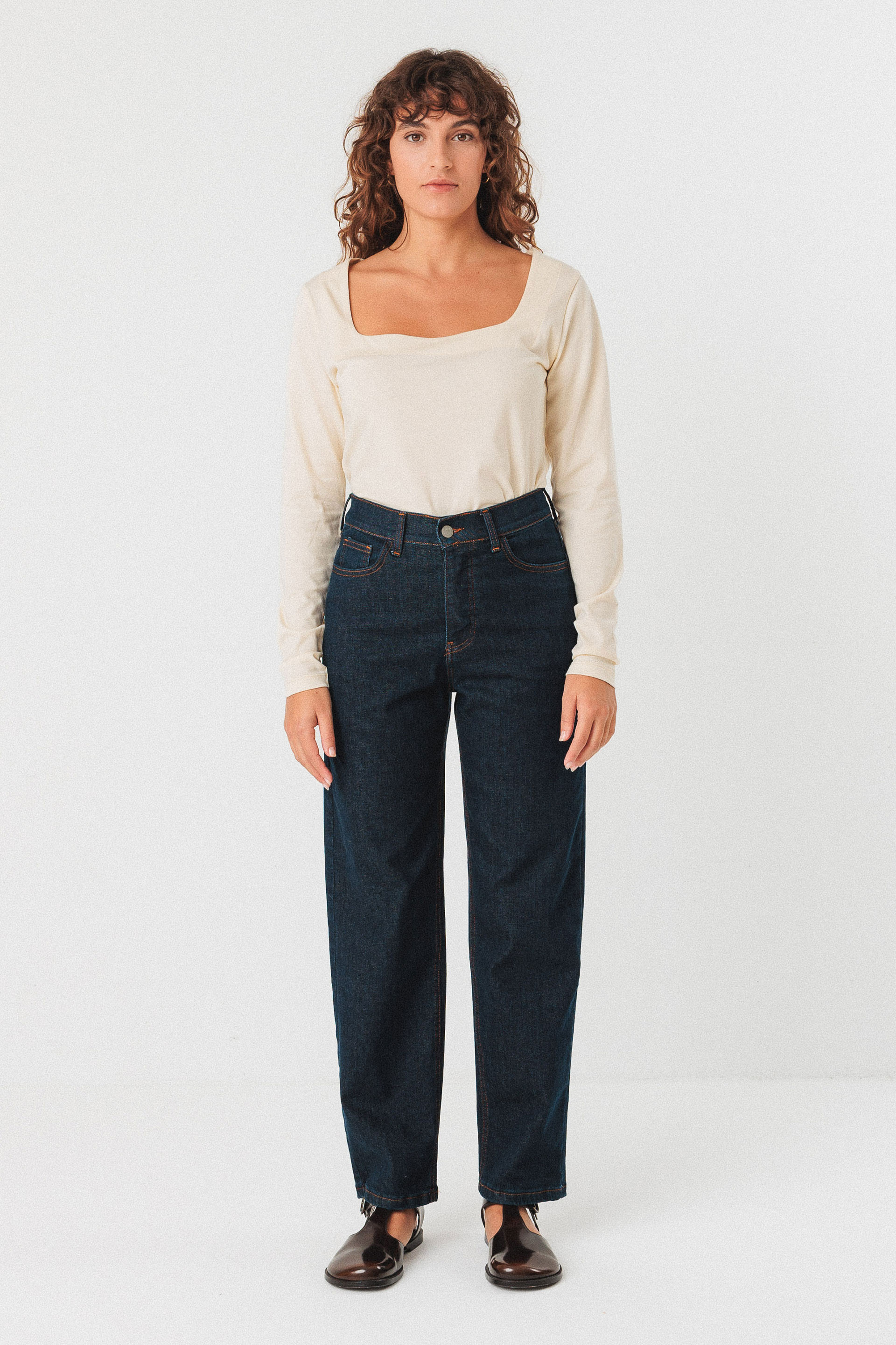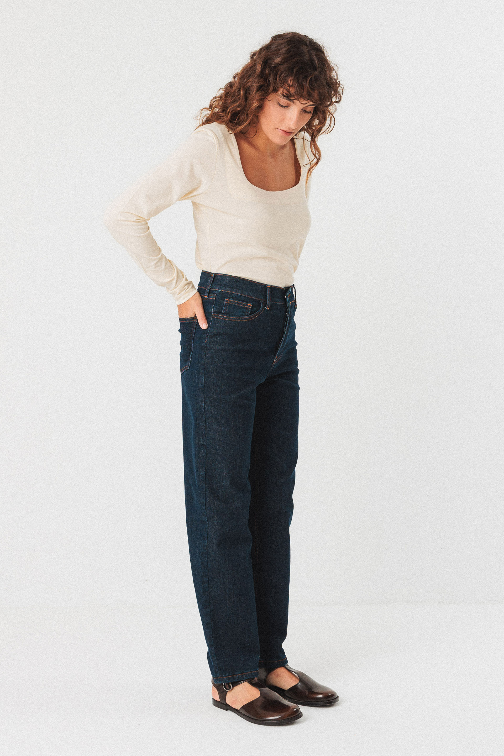 Pantalon en denim coupé droit, affichant une taille classique, des poches sur l’avant et une fermeture boutonnée devant.