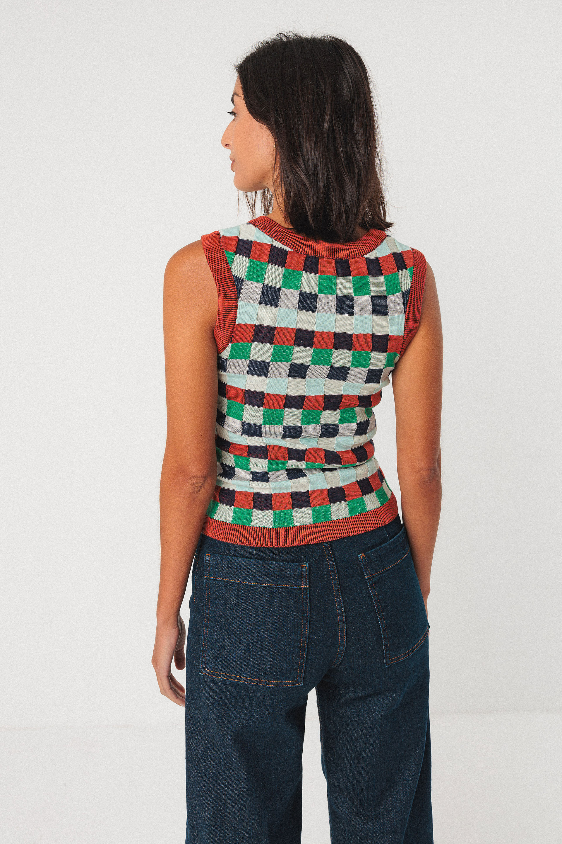 Haut sans manches en tricot affichant un motif à carreaux multicolore. Col rond et coupe ajustée.