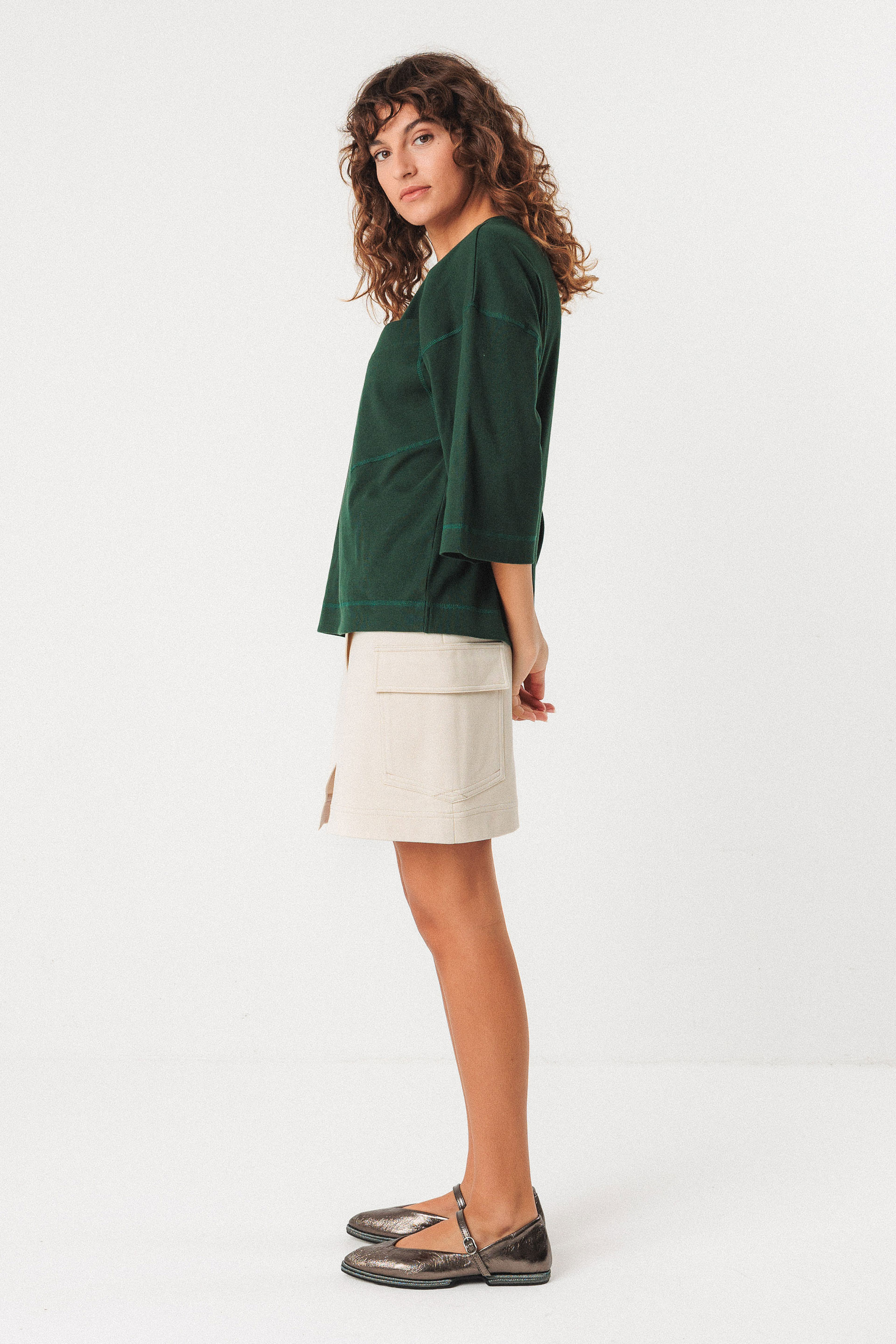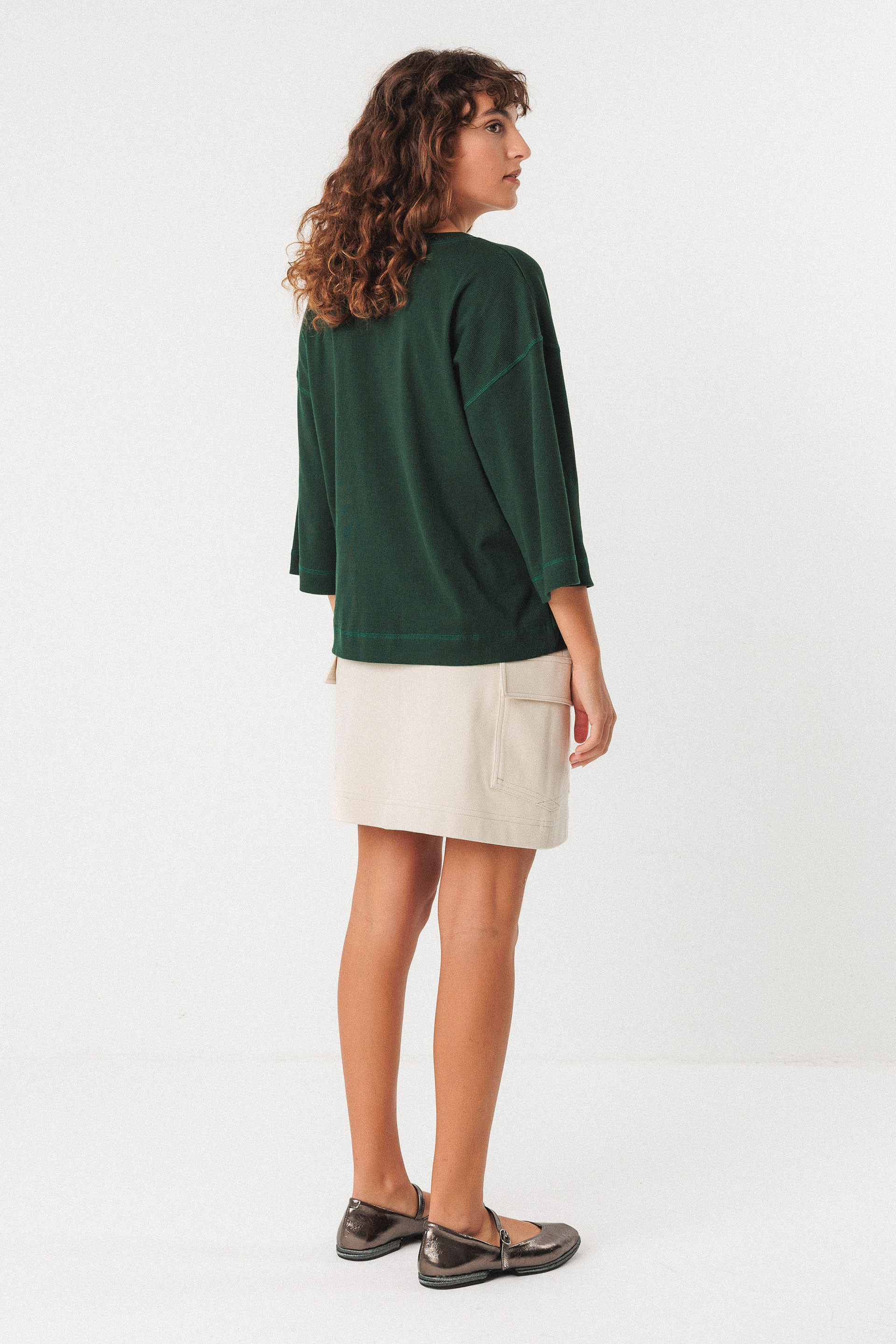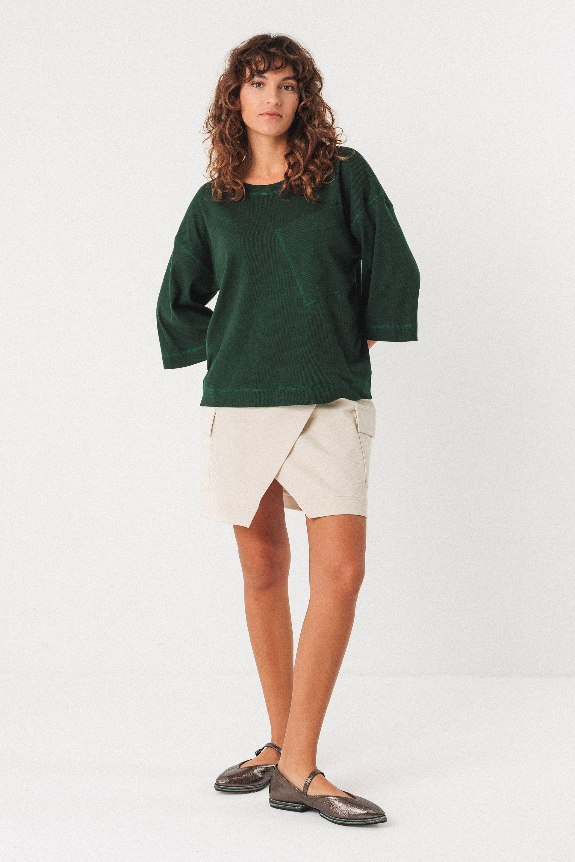 Ample t-shirt à col rond relevé d’une poche sur la poitrine et de coutures surjetées décoratives. Les manches sont coupées sous le coude.