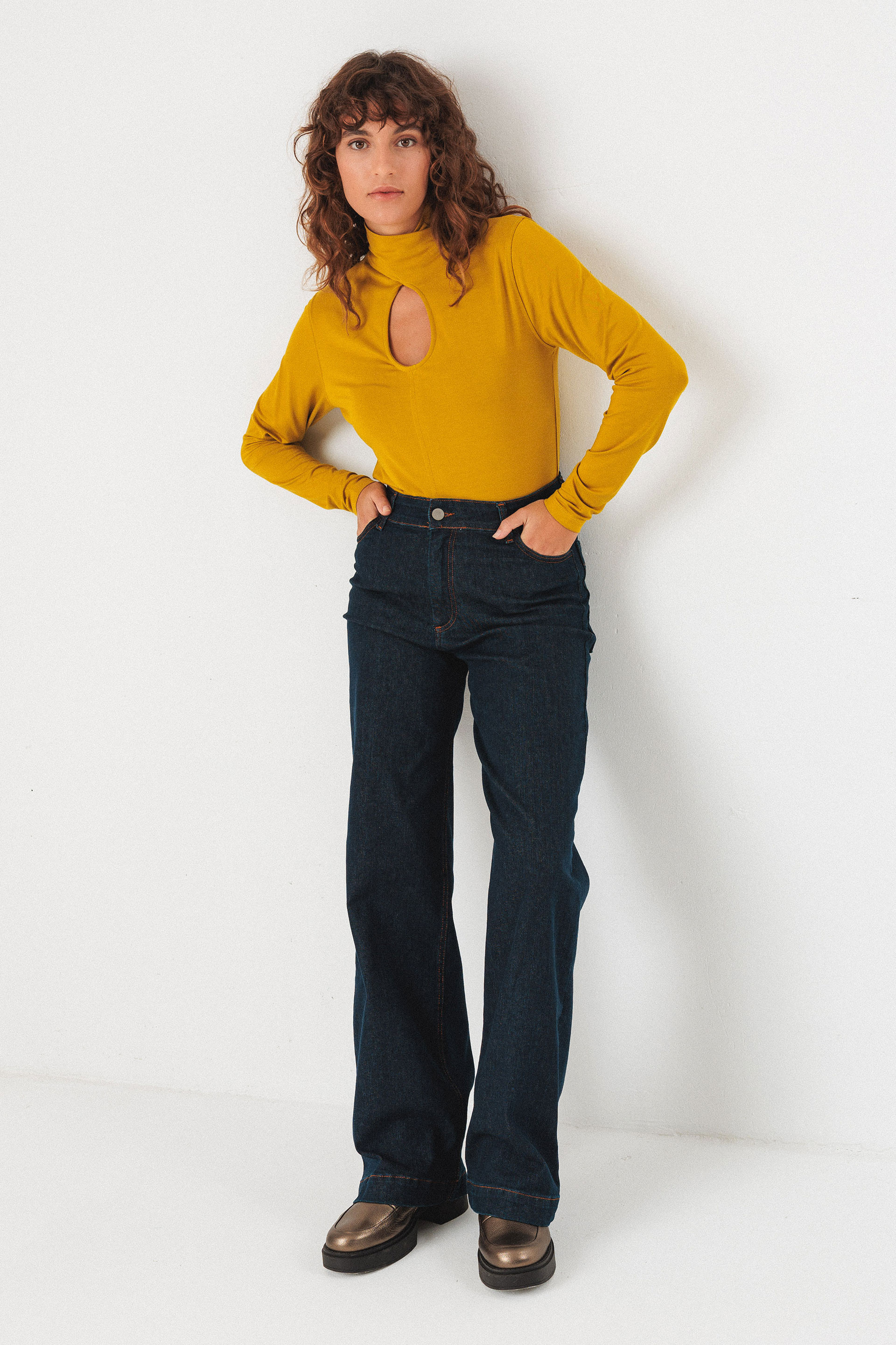T-shirt à manches longues avec un col montant à effet drapé et un détail de découpe devant. Coupe ajustée.