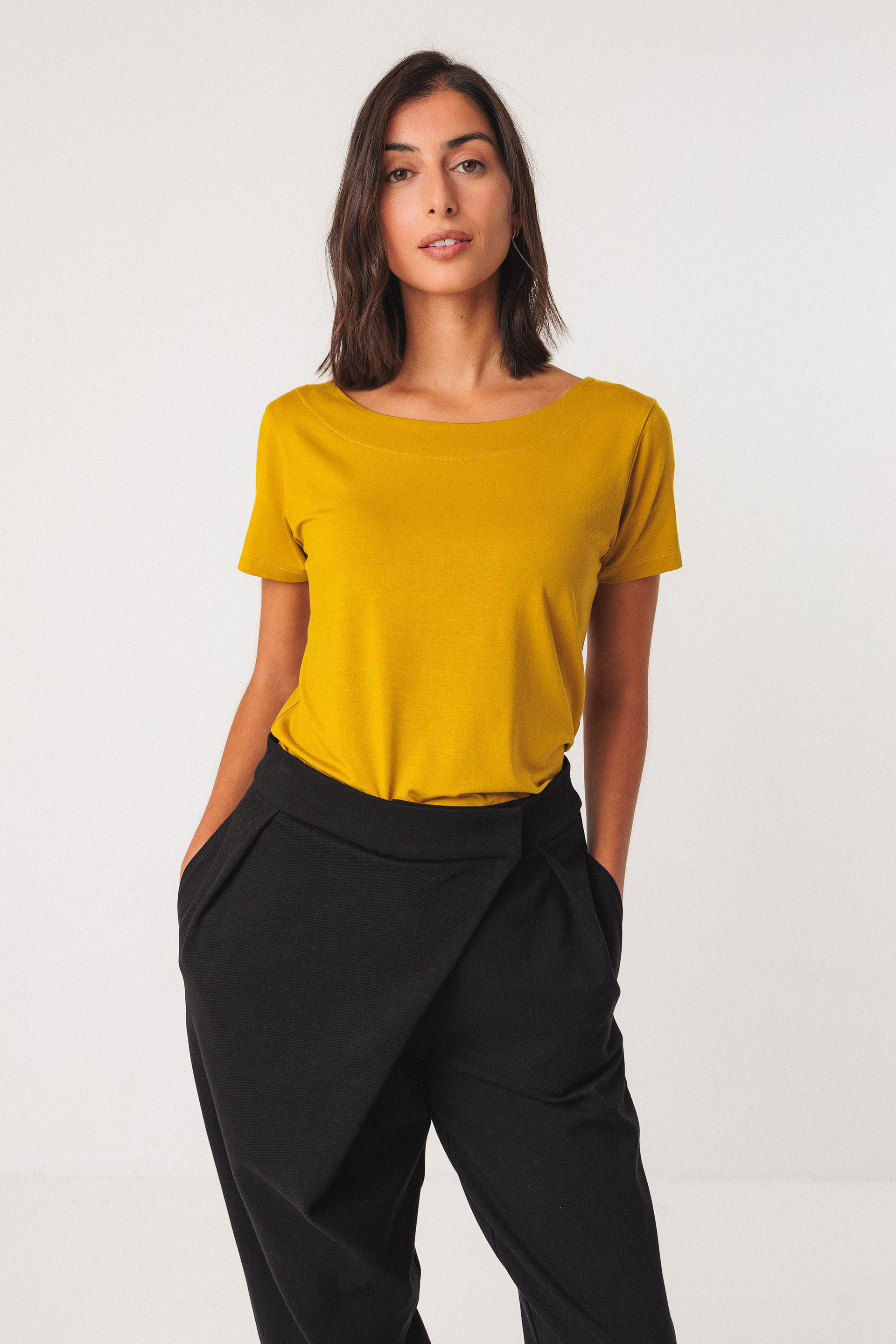 T-shirt à manches courtes et encolure bateau, avec une coupe ajustée.