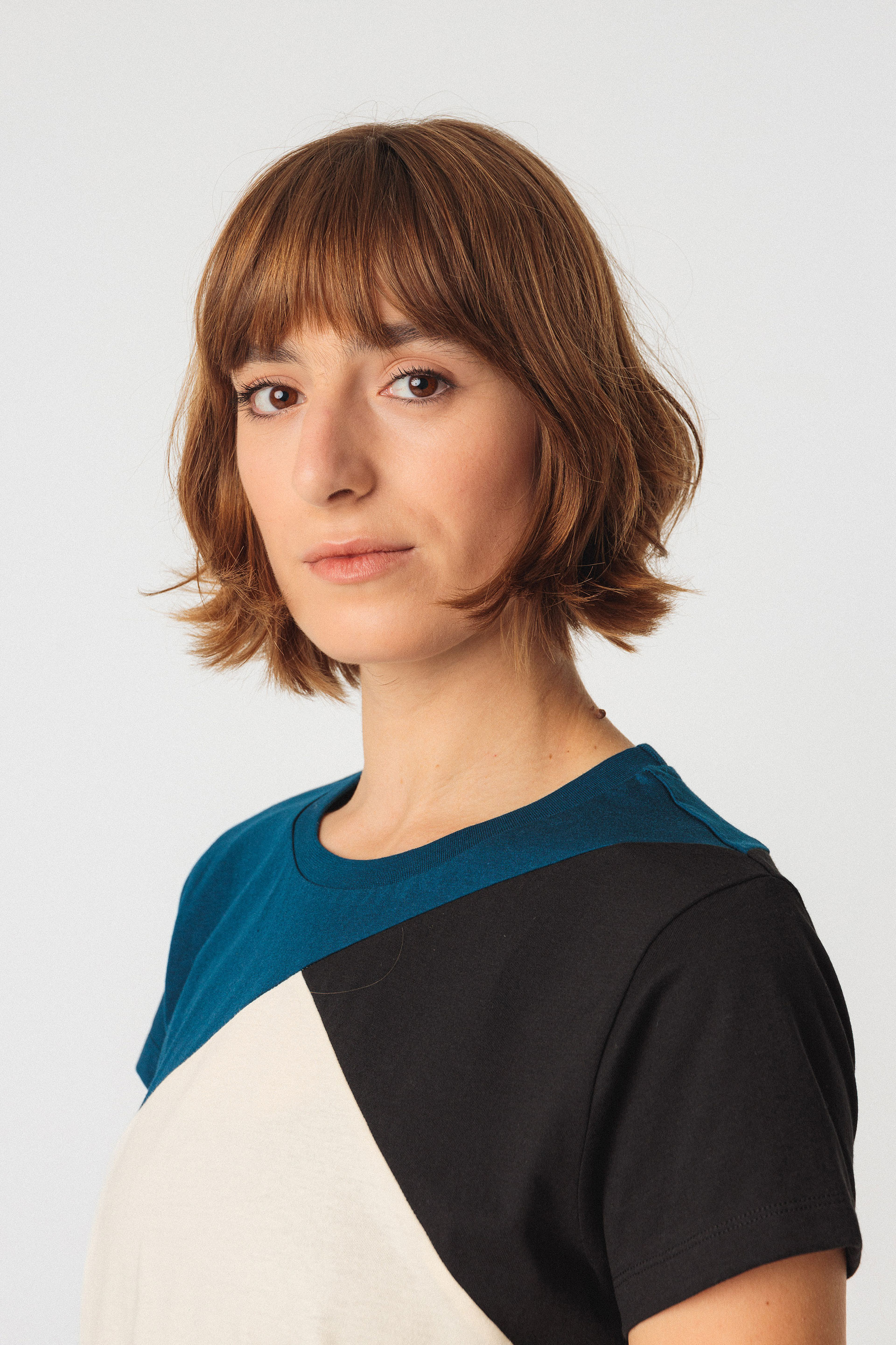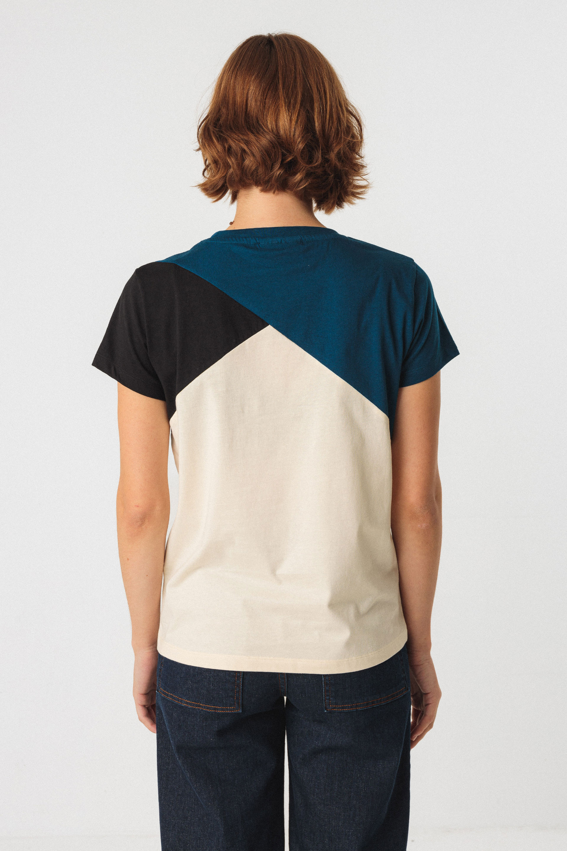 T-shirt à col rond et manches courtes affichant un jeu d’empiècements contrastants et une finition côtelée à l’encolure.