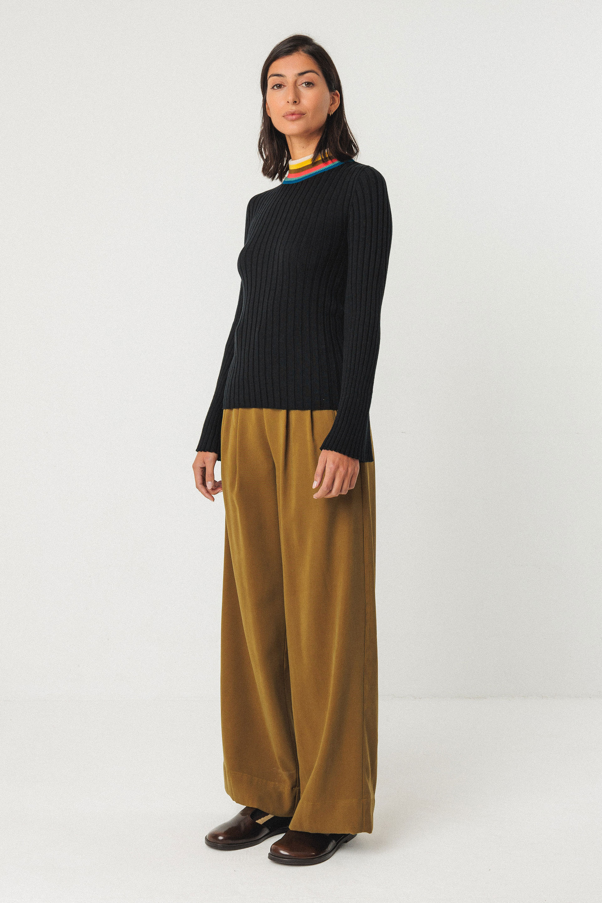 Haut en tricot à côtes léger de coton biologique certifié GOTS. Présente un col montant multicolore et des manches longues évasées.