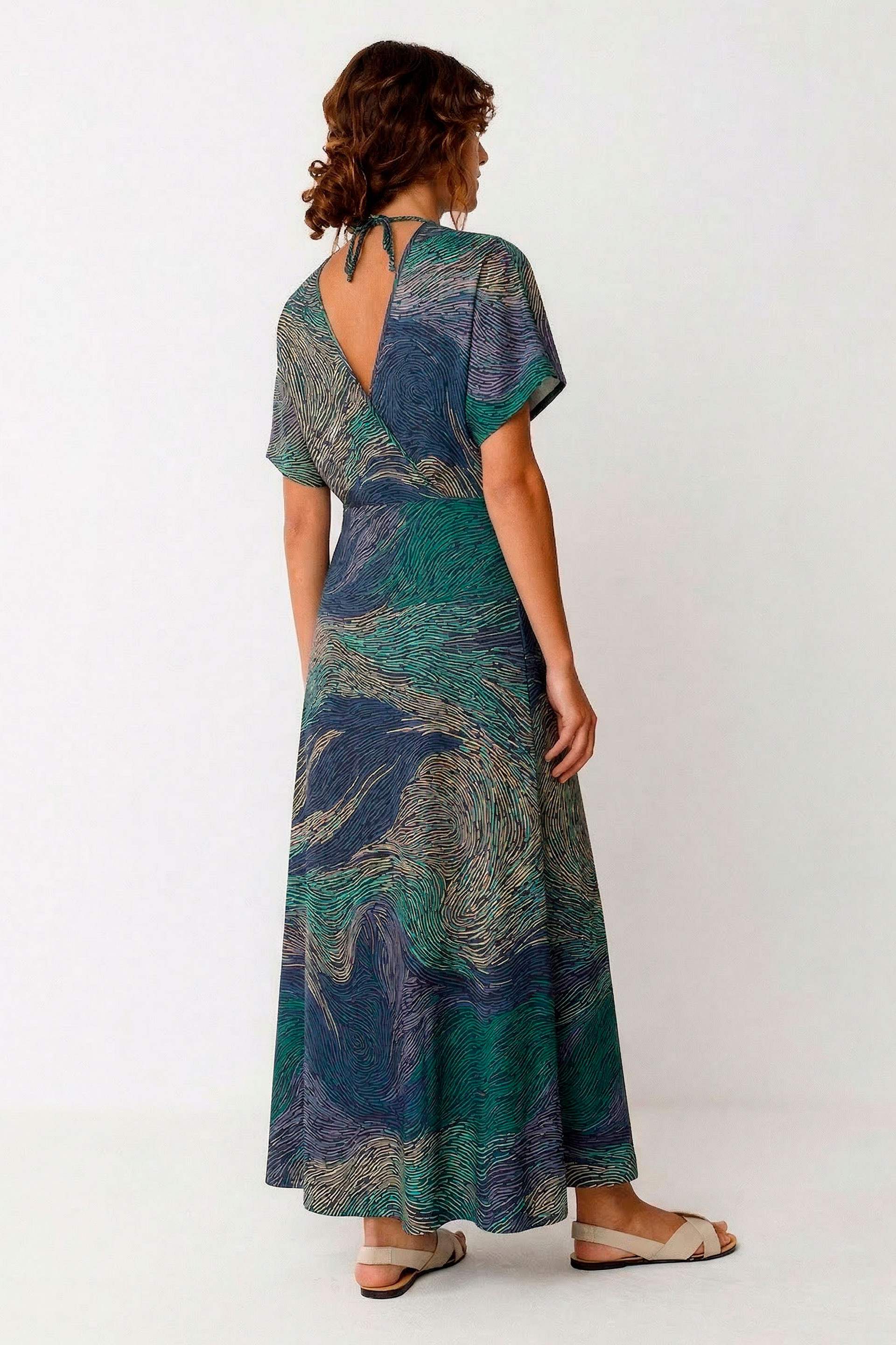 Robe kimono à taille haute et coupe mi-longue avec une jupe évasée. Elle affiche un col en V et des manches courtes.