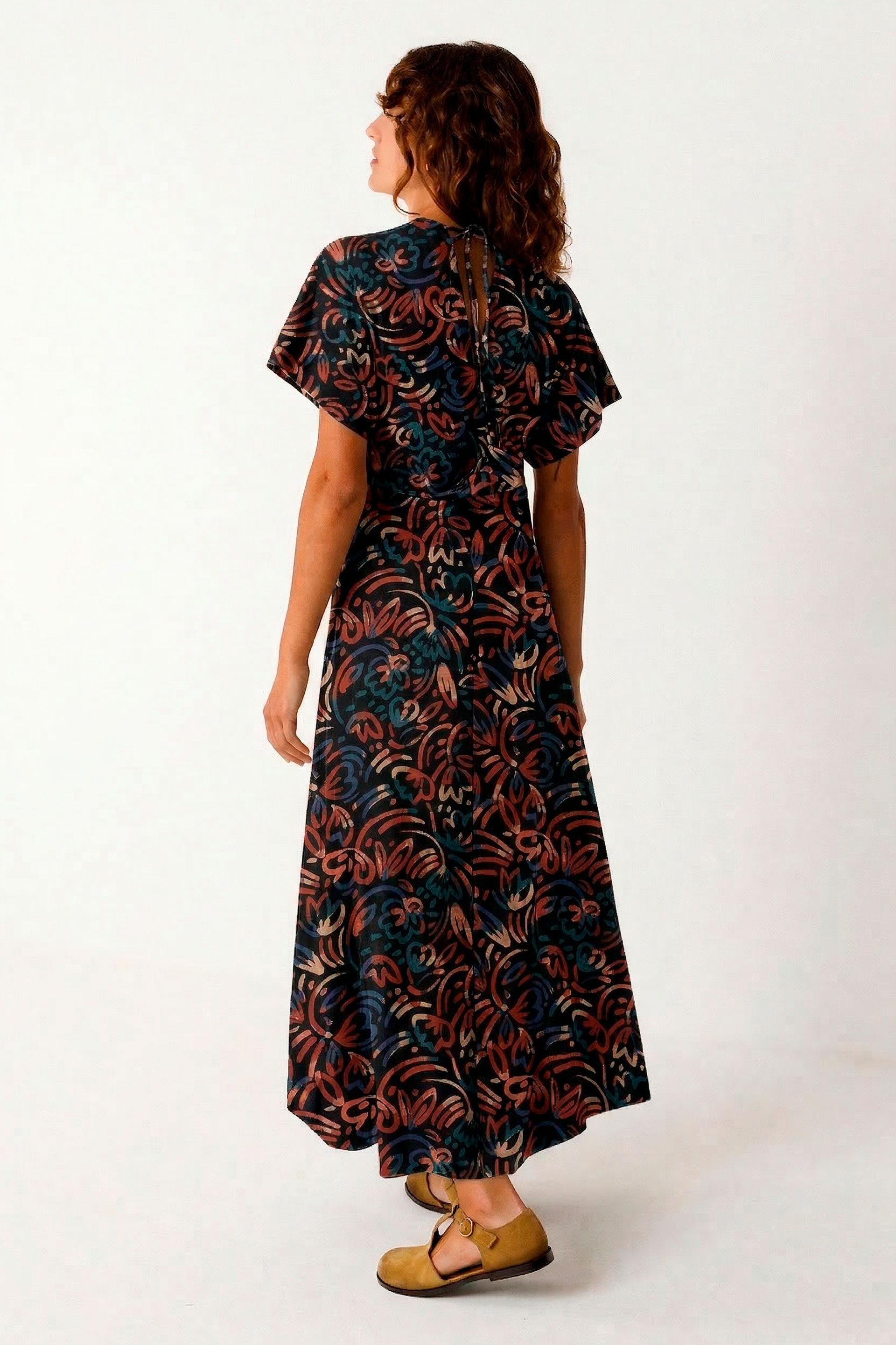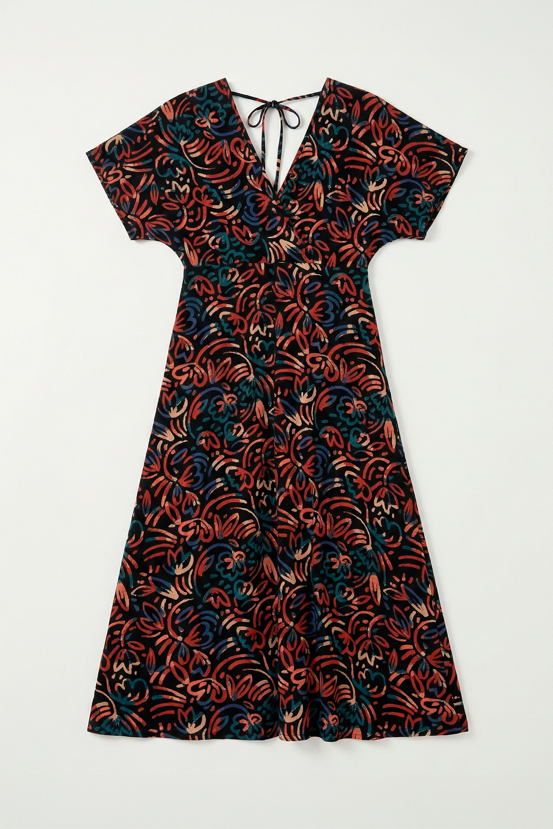 Robe kimono à taille haute et coupe mi-longue avec une jupe évasée. Elle affiche un col en V et des manches courtes.