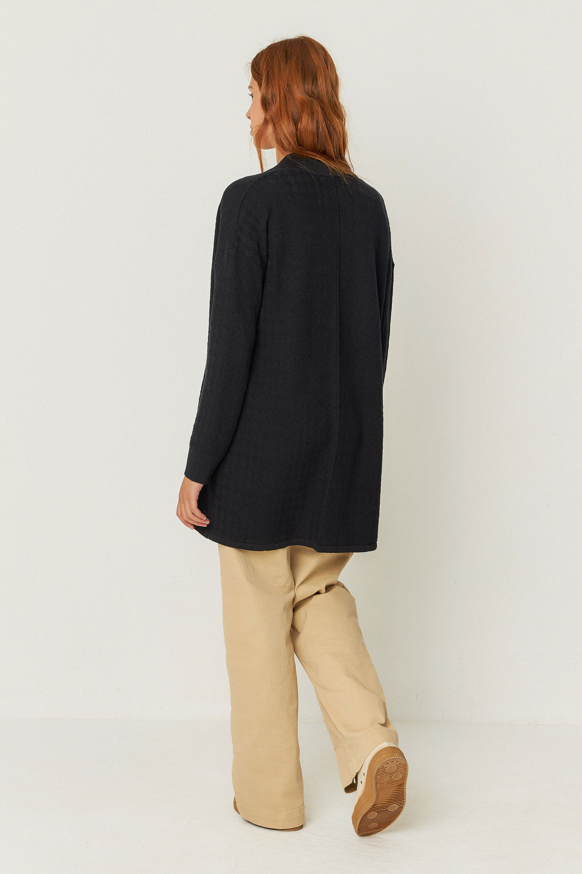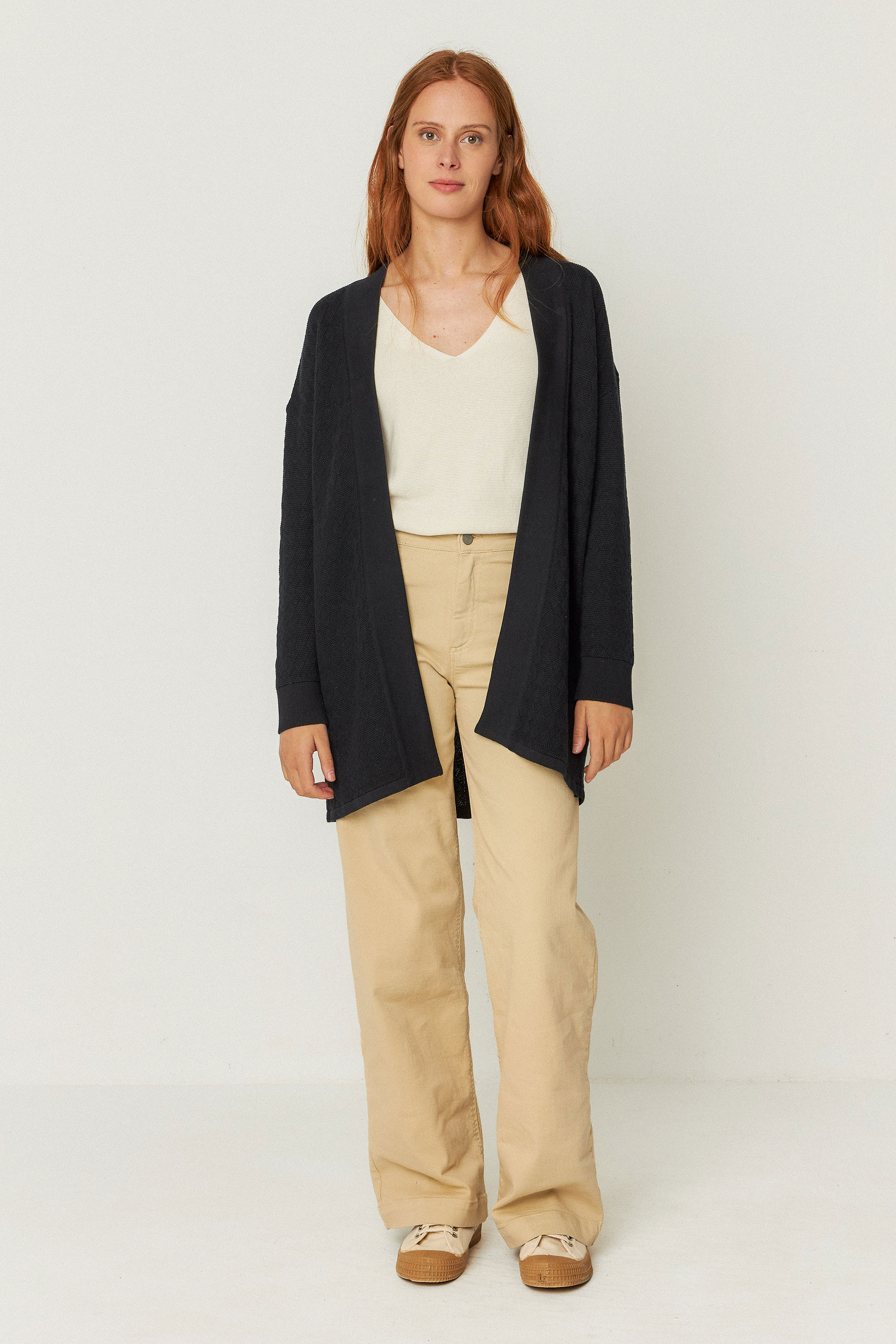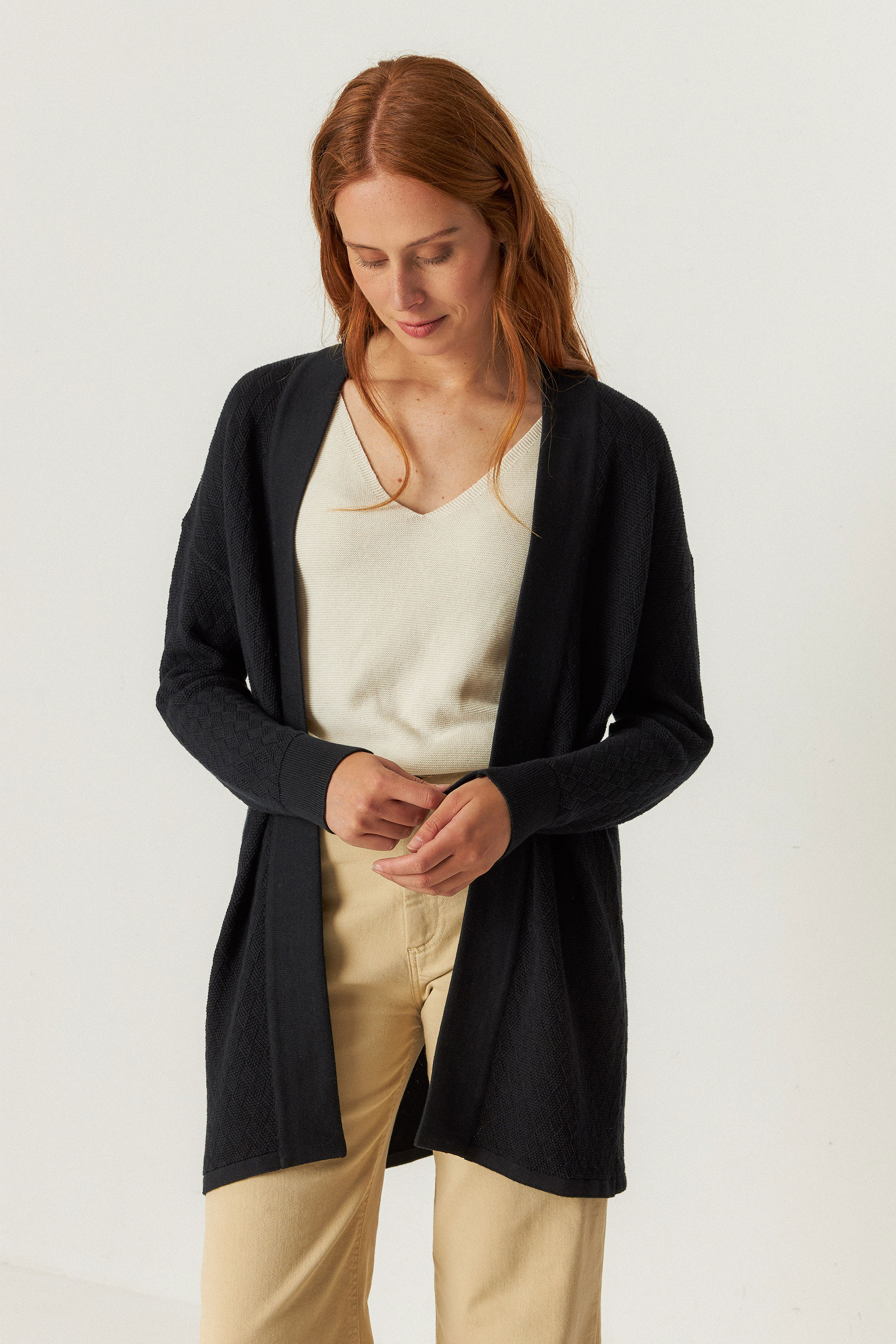Long cardigan ouvert sans col, confectionné en tricot de coton biologique certifié GOTS.
